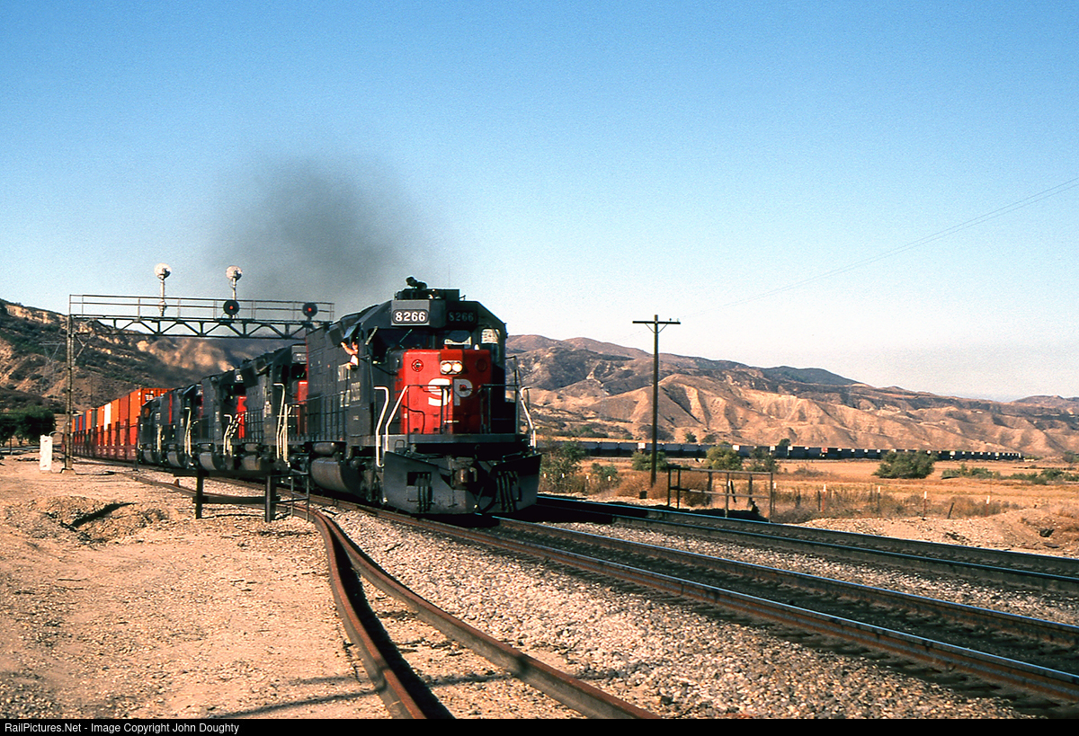 SP 8266, along with an SD-45 and three more tunnel motors, leads an eastbound doublestack through San Timoteo Canyon near the El Casco Lakes. It looks like the conductor has taped some newspaper on his side of the windshield to dampen the early morning sunlight coming into the cab.
