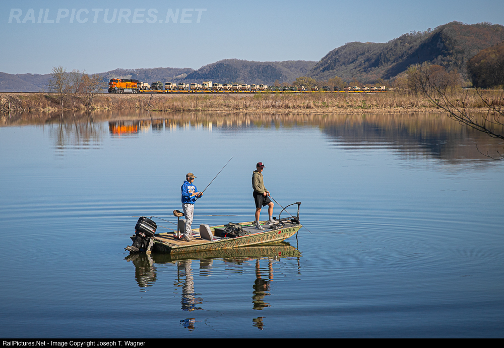Machines of war fall into formation behind the high command of BNSF orange, spearheading eastbound military special U FTLPAD1 15M across the causeway at Cold Springs Landing near Lynxville, WI. The tall bluffs that line the Upper Mississippi River Valley loom large at the train's back as it moves down a rather scenic stretch of the railroad's Aurora Subdivision on a crystal clear spring morning. This 5800 foot cross-country convoy of military equipment is operating between the Army bases at Fort Lewis, WA, near Tacoma, and Fort Knox, KY, via the P&L at Paducah. With lines in, a couple of local fisherman try their luck in the calm waters below hoping for a bite, completely oblivious to both our presence and the passing train behind them.