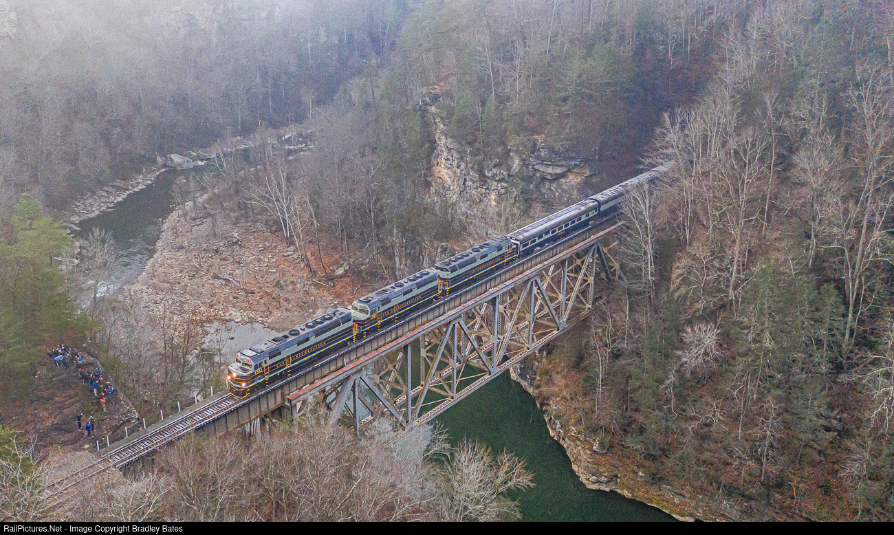 | It's just after daybreak and the fog is still hanging as CSX P001-19, the 80th anniversary of the CSX Santa Train heads south across Pool Point trestle in Elkhorn City, KY. |