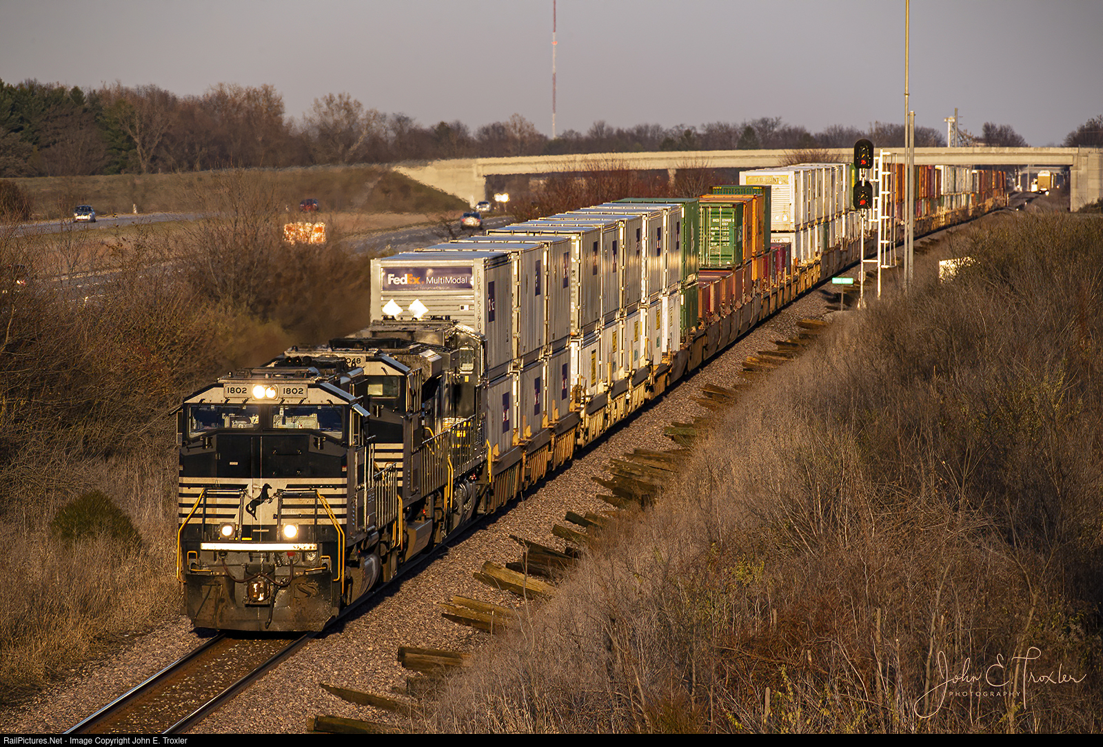 | Rebuilt from a standard cab SD70 (former NS 2502), NS 1802 leads the 259 stack train westbound across the Buck Creek, IN scanner on a nicely lit late afternoon November day. |