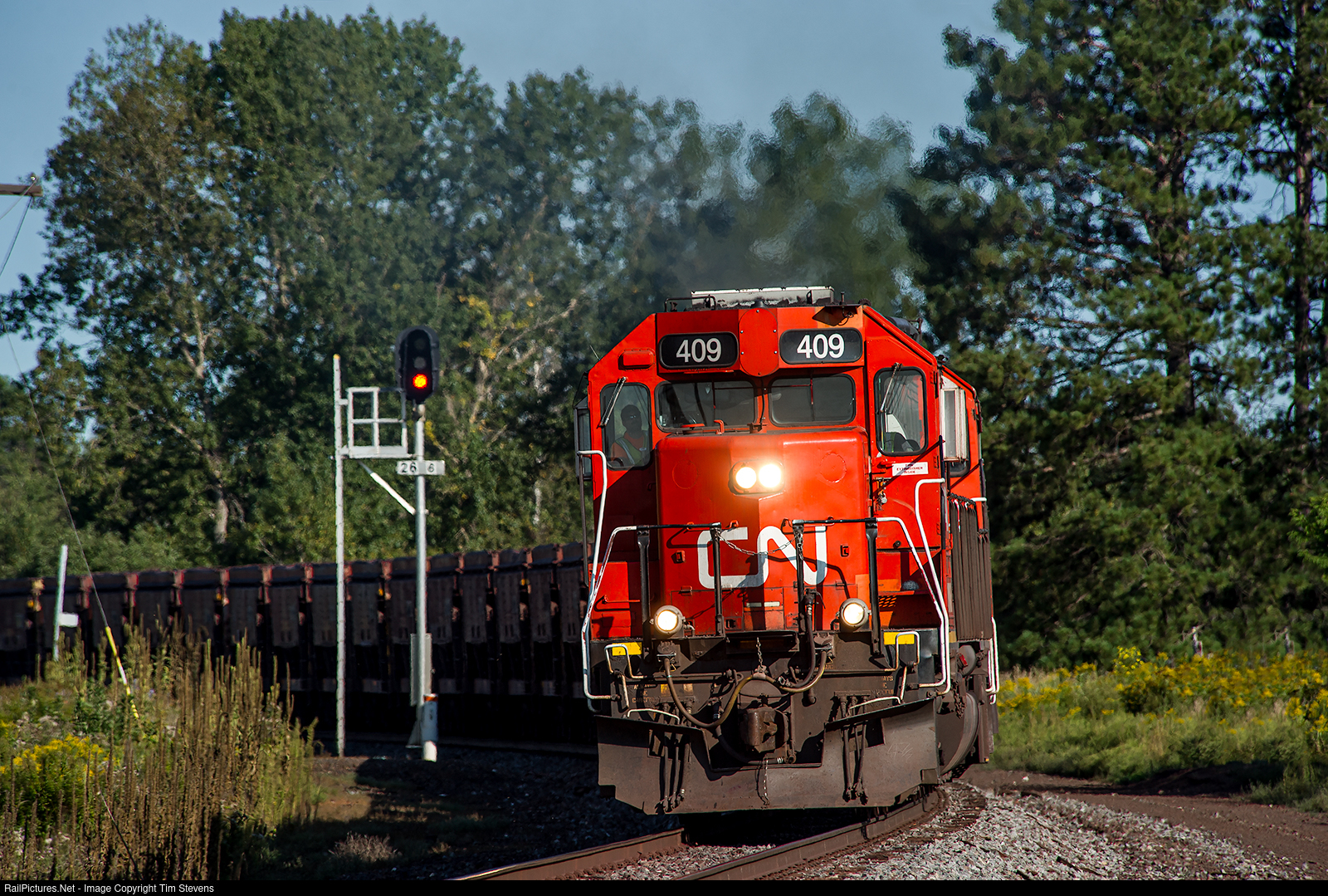 | Hauling 137 iron ore empties north for another load, DMIR SD40T-3 409 passes the intermediate signal at Mile 26.6 on CN's Missabe Sub. |