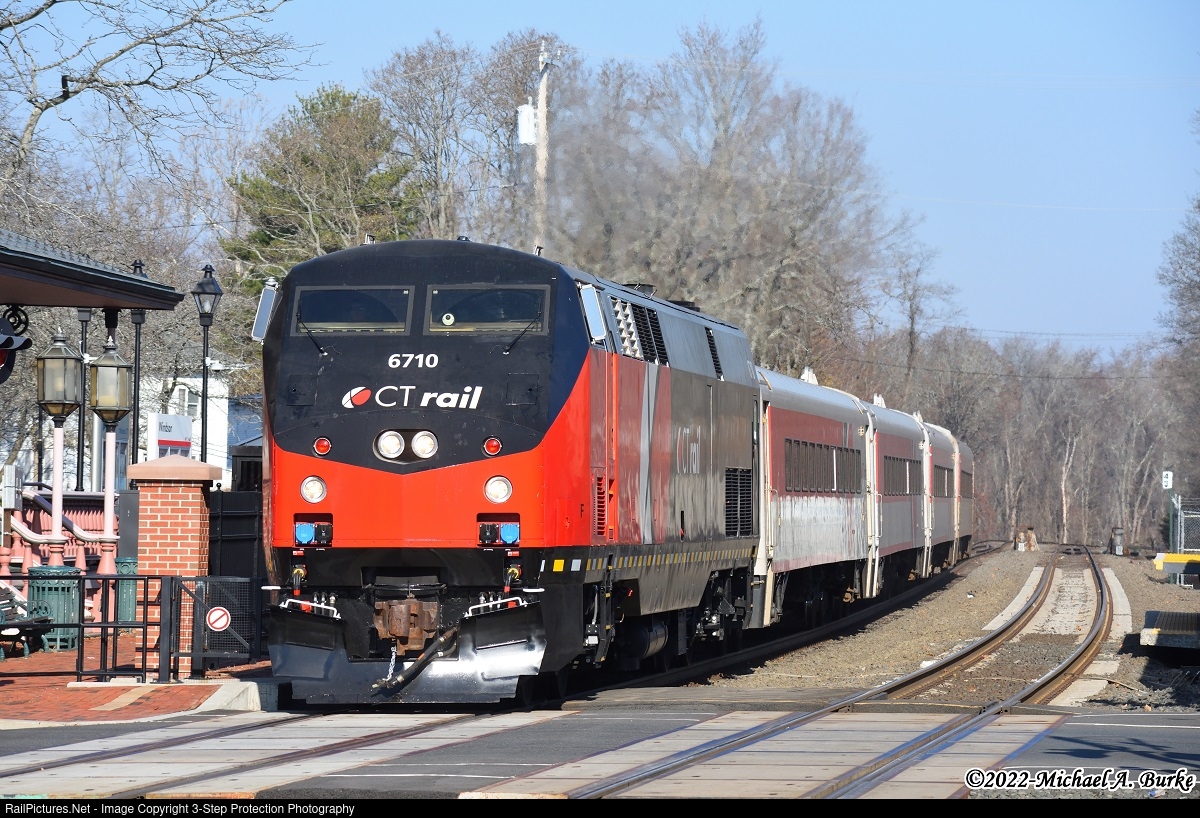 | On the Wednesday morning before Thanksgiving, the 11:07am CTrail train 4403 approaches Central Street in Windsor. The train crew is Engineer Dave Horree and Conductor Greg Grice, both friends and long-time avid rail photographers. |