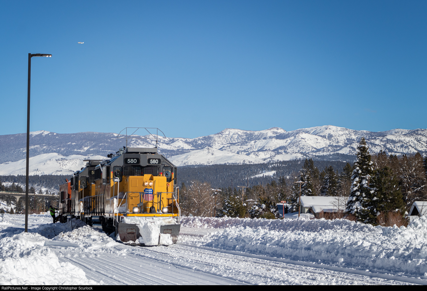 On a beautiful snowy morning, UP 580 sits with its flanger set in Truckee.