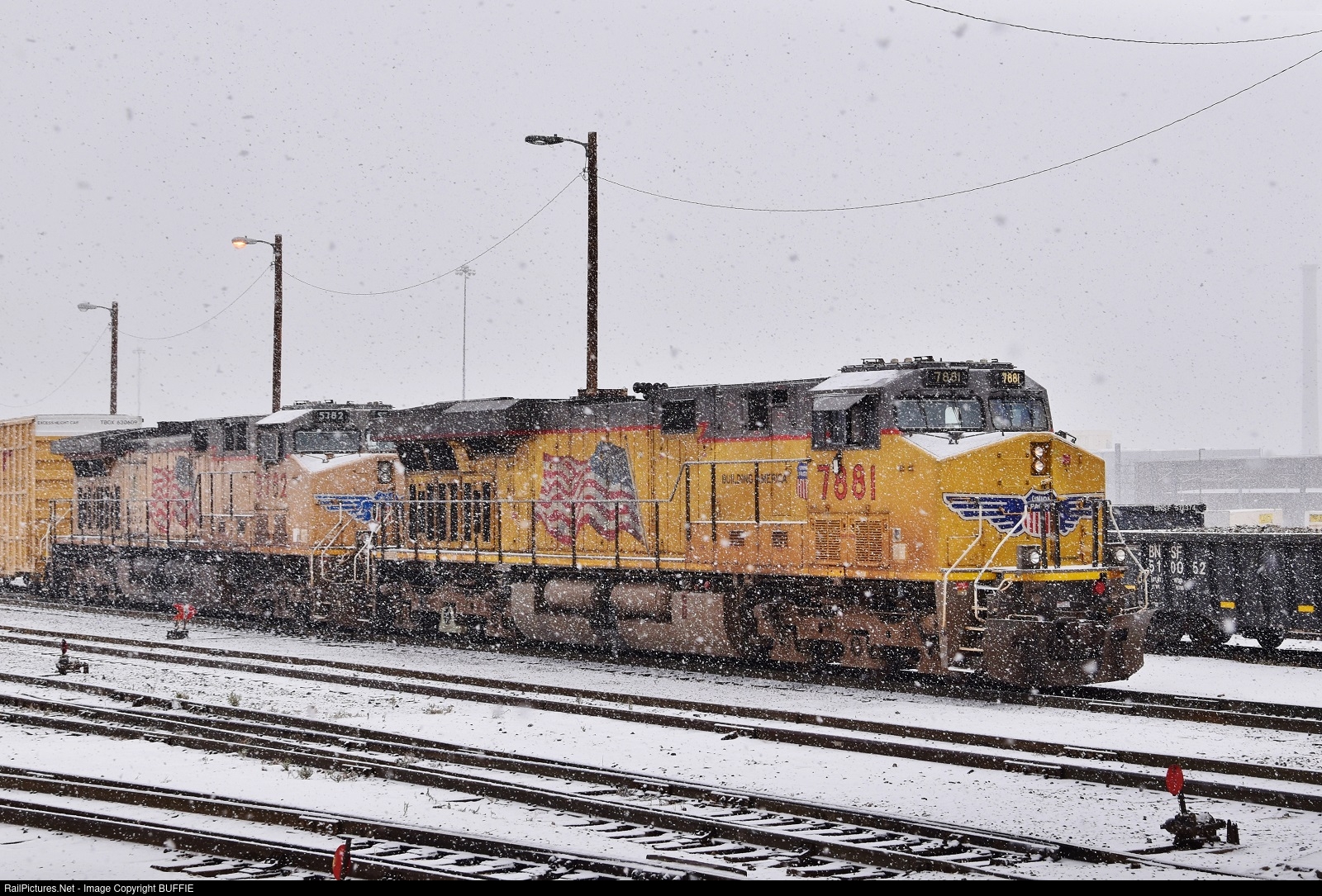 UP 7881 (ES44AC) brings a freight into the North Yard as a snowstorm blankets the area with fresh powder.
