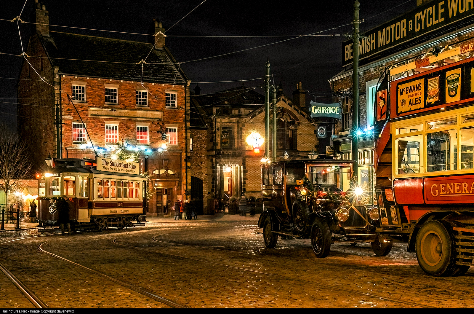A Beamish museum Christmas. Sunderland tram is at the 1913 Town tram stop waiting to carry visitors back to the musem entrance. A 1909 omnibus has just delivered more people to see how people in 1913 celebrated Christmas