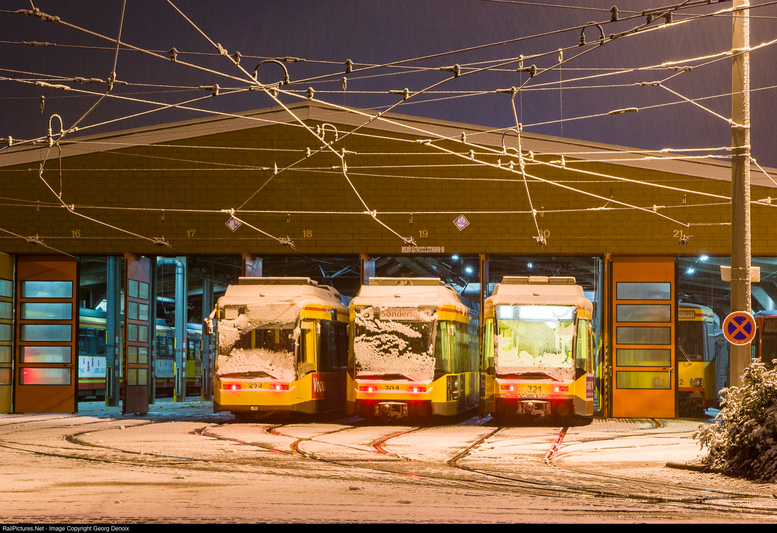 Three GT6-70D/N streetcars are getting dusted in some light snow while laying over at the Tullastrasse yard in Karlsruhe.