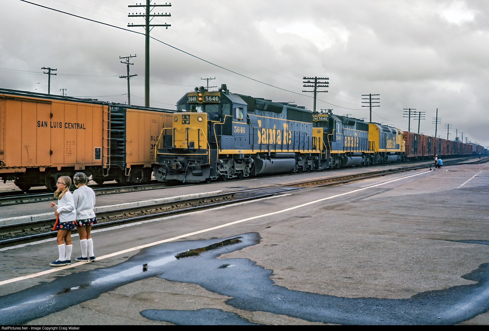 Passing the Amtrak station in Fullerton as it heads east out of Los Angeles' Hobart Yard is an Atchison Topeka & Santa Fe Railway freight, with SD45-2s 5646 and 5640, along with an FP45, for power. Then, as now, Fullerton was often a magnet for kids who wanted to see trains … although, most likely, these kids were simply waiting for a westbound Amtrak San Diegan to arrive. Note the classic "Herby" chalk marking on the closest San Luis Central refrigerator car! (Fullerton, California – August 3, 1973)