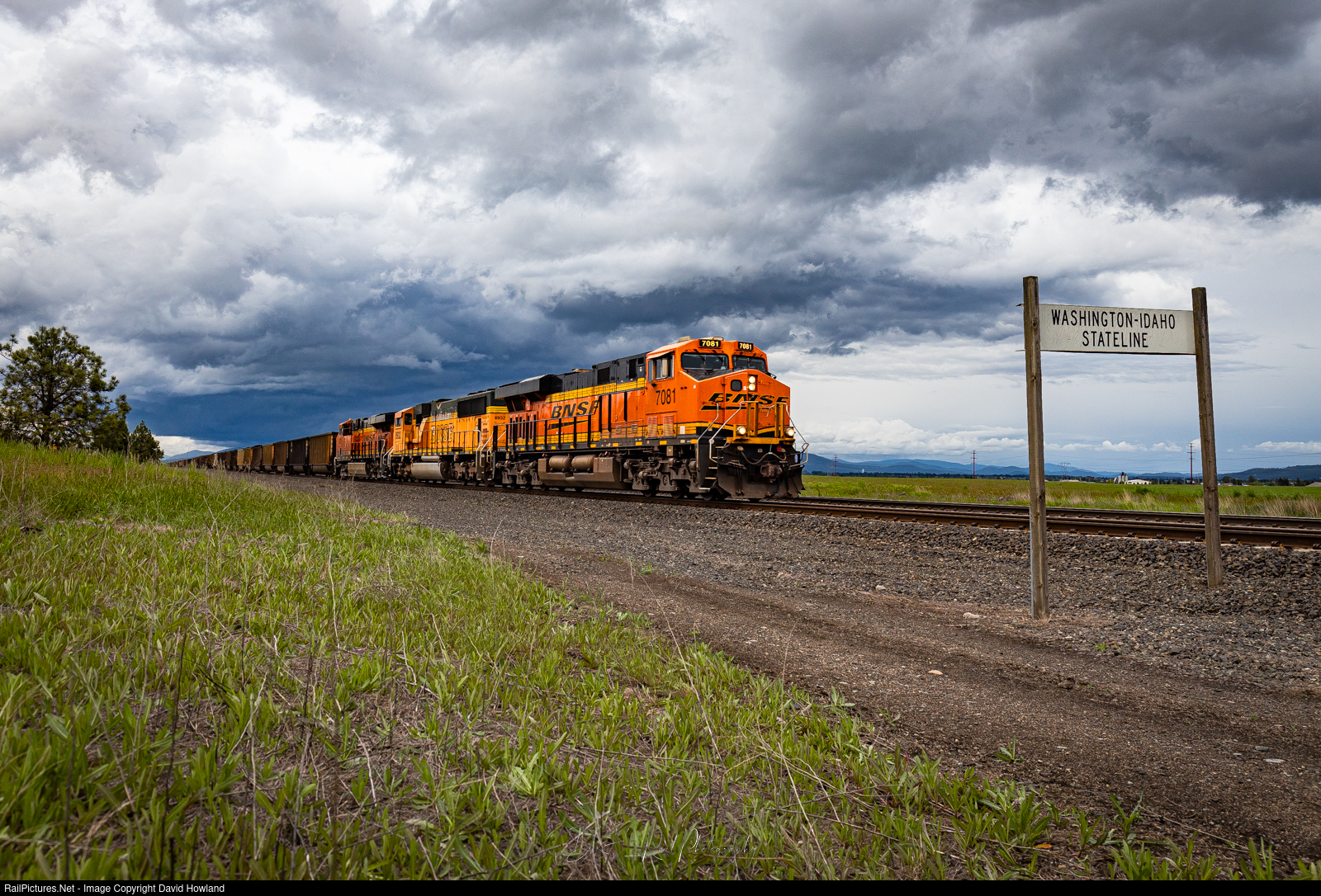 A BNSF coal train rolls past the Washington Idaho border with stormy skies in the background.