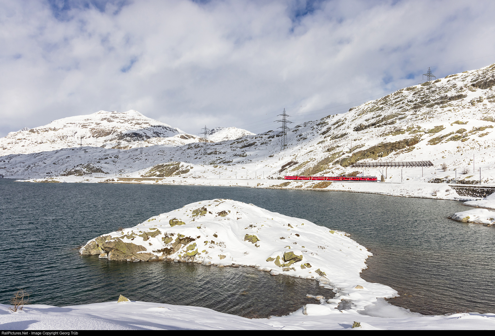 Railcars ABe 4/4 ("TW III") # 54 and # 51 of the Rhaetian Railway, built in 1988/1990 by SWA and BBC, are pulling the regional train 4629 from St.Moritz to Tirano along the Lago Bianco (White Lake) on the Bernina pass, about 2250 meter a.s.l. It is planned that from the timetable change on December 11, these railcars will (probably) no longer pull regional trains, but only the seasonal BERNINA EXPRESS trains between Tirano and St.Moritz and vice versa.