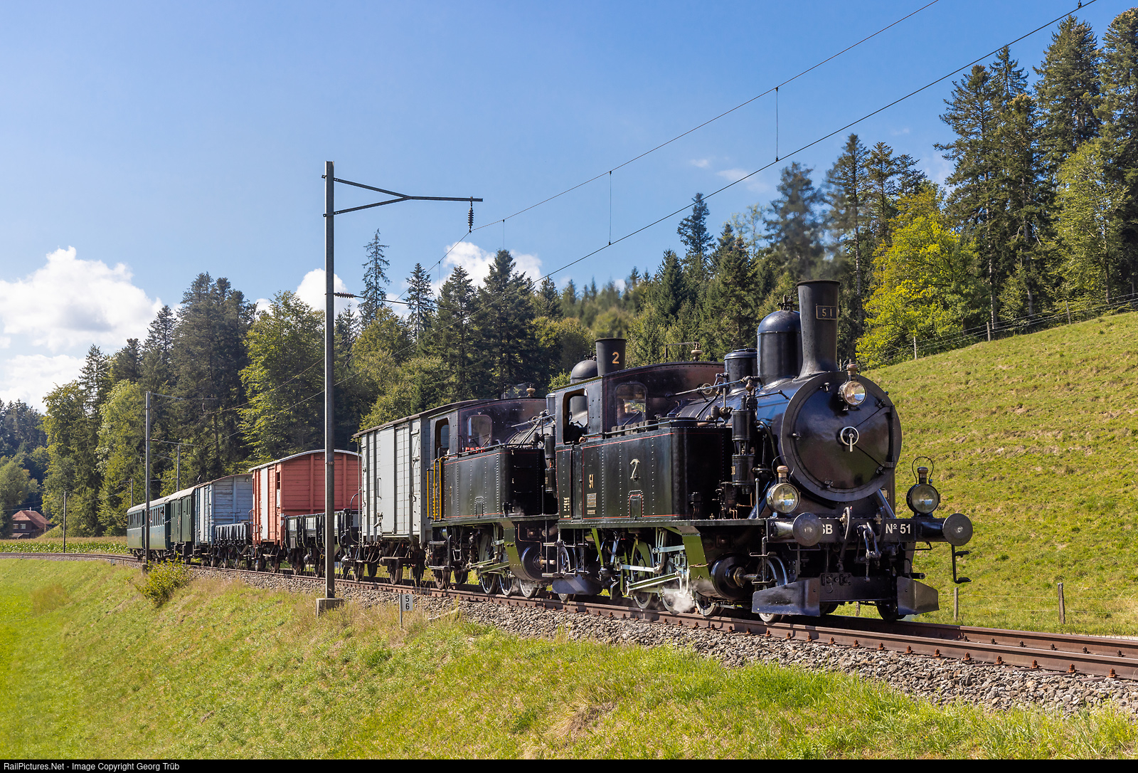 | Ed 3/4 # 51 of the Dampfbahn Bern (DBB), together with Ed 3/4 # 2 of the Verein Historische Eisenbahn Emmental (VHE) is pulling a mixed passenger/freight train near Sumiswald-Grünen on the Emmentalbahn. |