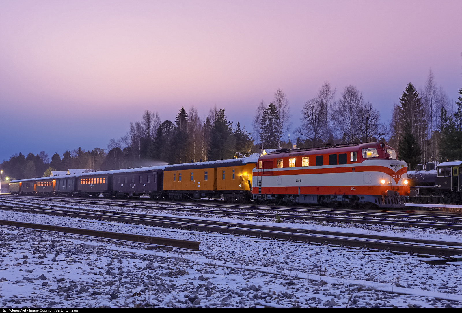 Blue hour is at it's peak when Haapamäki museum locomotive society (HMVY) Dr12 class diesel electric locomotive number 2216 with 1950s wooden coaches is seen preparing to depart Haapamäki towards Rauma where it will run heritage trains around Rauma and Pori in the west coast of Finland