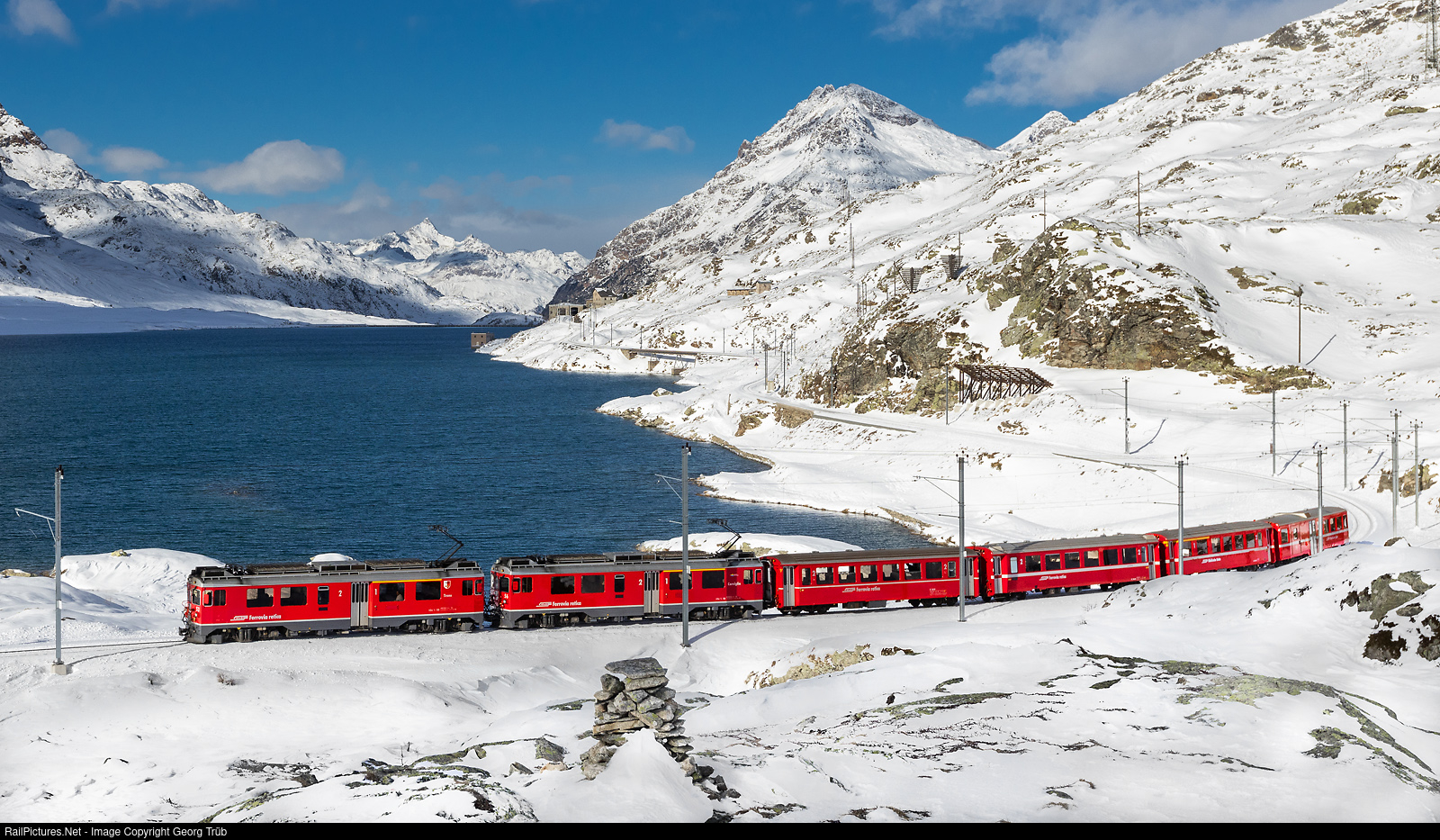 Railcars ABe 4/4 ("TW III") # 53 and # 56 of the Rhaetian Railway, built in 1988/1990 by SWA and BBC, are pulling the regional train 1625 from St.Moritz to Tirano along the Lago Bianco (White Lake) on the Bernina pass, about 2250 meter a.s.l. It is planned that from the timetable change on December 11, these railcars will (probably) no longer pull regional trains, but only the seasonal BERNINA EXPRESS trains between Tirano and St.Moritz and vice versa.