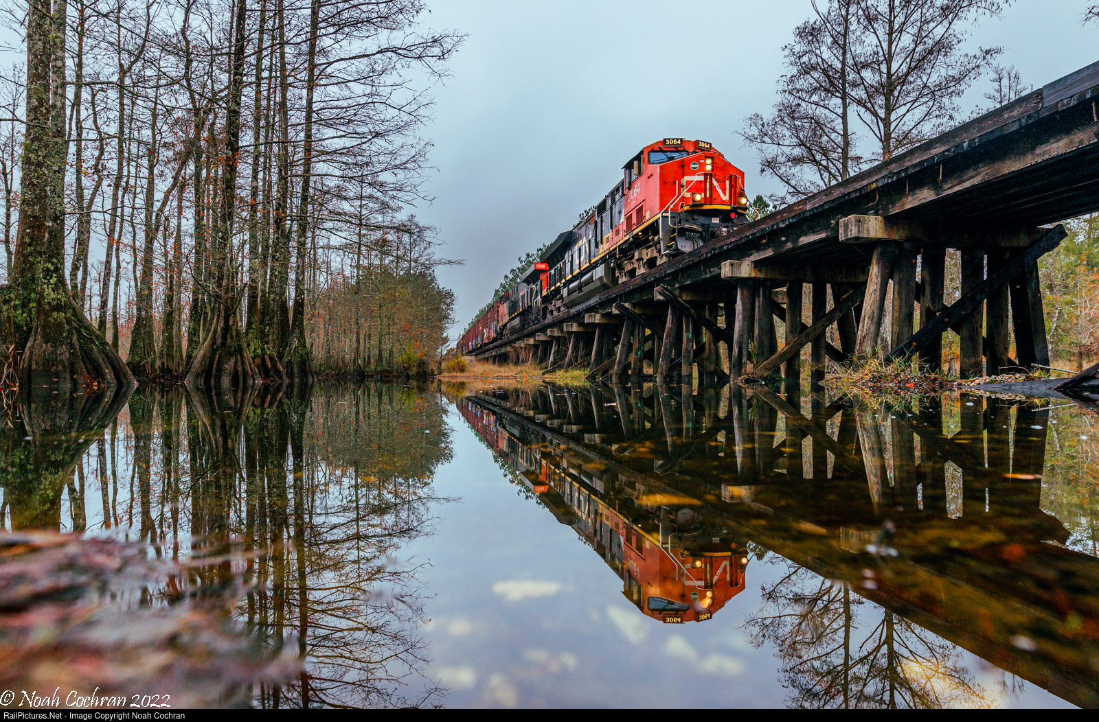A pair of CN GEs bring Memphis, TN to Mobile, AL freight A488 through Merrill, MS on CN’s Beaumont Subdivision. Here they are framed crossing a small marsh just east of the Pascagoula River.