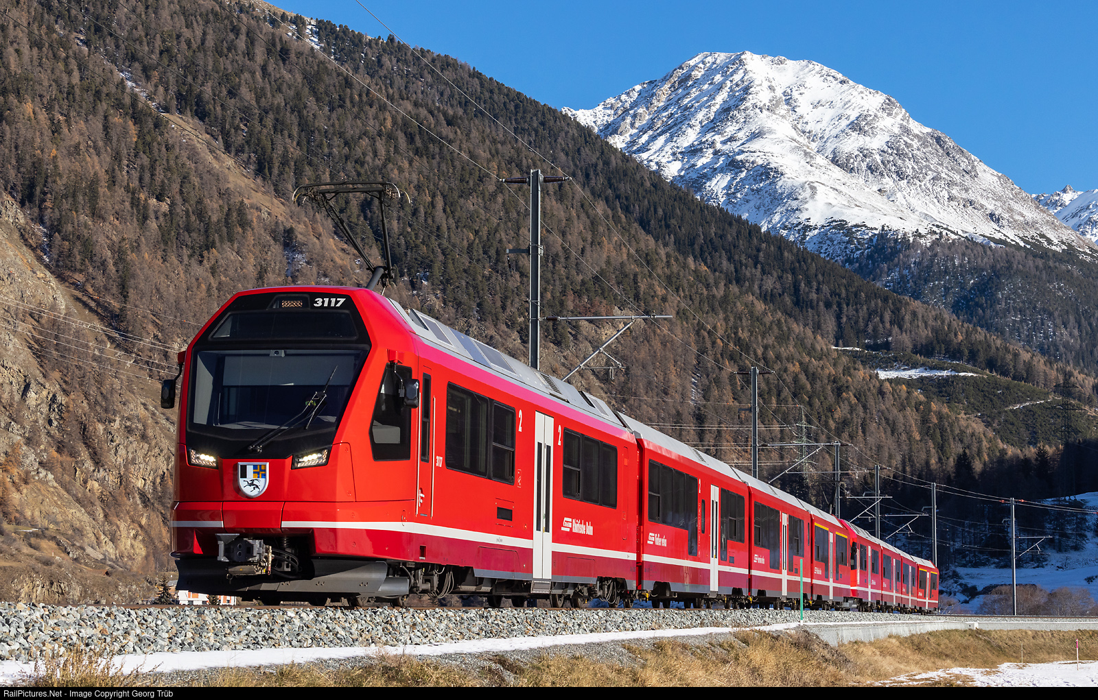 | "Capricorn" trains ABe 4/16 # 3117 and # 3143 of the Rhaetian Railway in multiple control are running the Regio Express 1342 from St.Moritz via Samedan-Zernez-Vereina Tunnel-Klosters-Küblis to Landquart, between Carolina and Zernez. The RhB ordered 56 of this trains from StadlerRail, about 37 are delivered yet. |