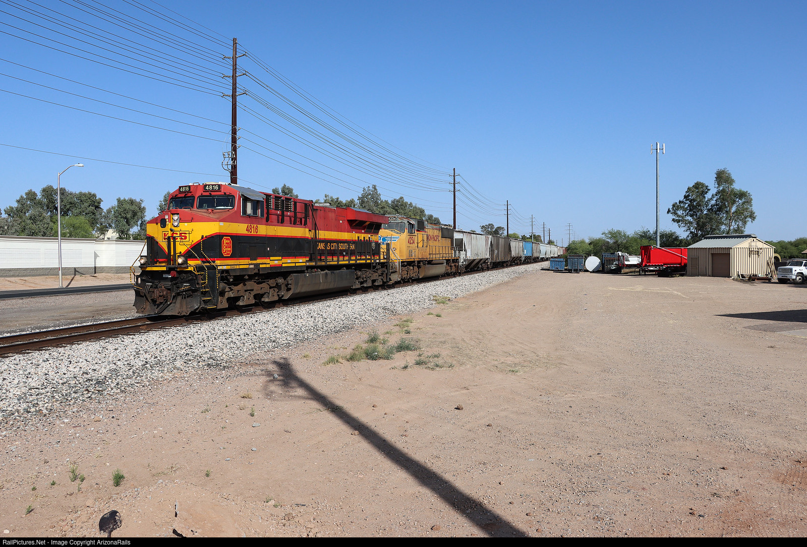 | A Kansas City Southern "Southern Belle" is on point of the daily Herrington, KS to Phoenix, AZ manifest train as it rolls west through the growing town of Gilbert. |