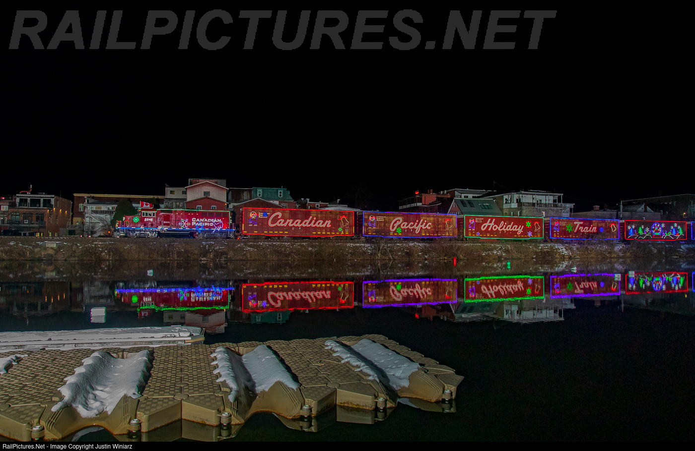 The CP Holiday Train heads for Farnham as it skirts the Magog River