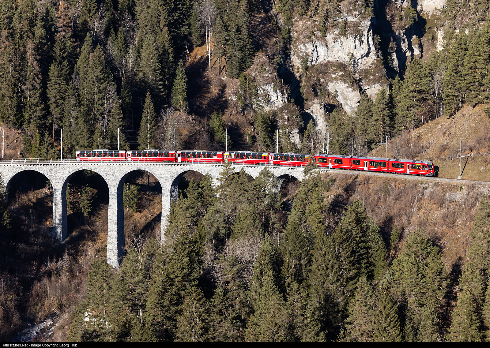 | "Allegra" ABe 8/12 # 3502 of the Rhaetian Railway is pulling the PE 951 BERNINA EXPRESS from Chur over the Albula and Bernina line to Tirano, crossing the 137 meter long and 35 meter high Schmittentobel viaduct between Alvaneu and Filisur. |