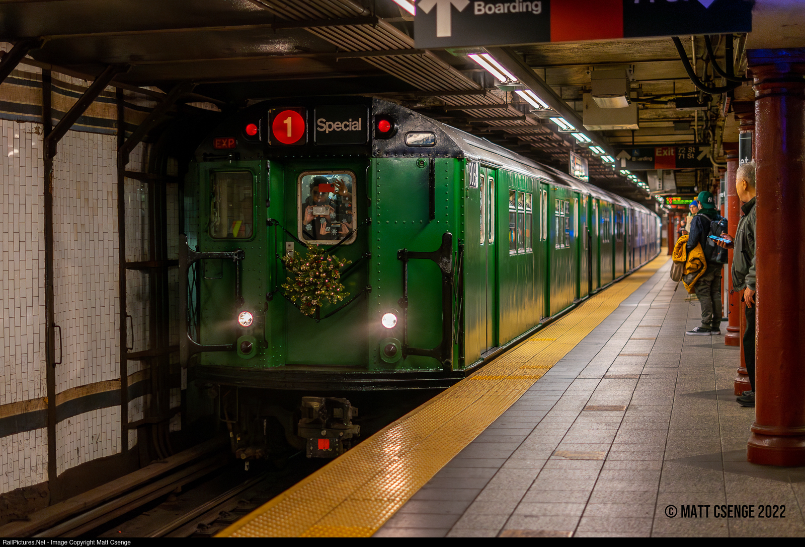 Sixties Subway Special. On Sunday November 27, 2022, the NY Transit Museum ran the first day of their Holiday Nostalgia Rides for the 2022 holiday season! Unlike previous years, the event switched to the former Interborough Rapid Transit (IRT) lines using the museum's "Train of Many Colors," which features a variety of cars manufactured in the 1960s wearing various paint schemes from throughout their service lives. R33 no. 9069 (St. Louis Car Co., 1962-1963) is the lead motor on the train as it arrives at 72nd St Station on the IRT Broadway-7th Avenue Line. The car and "Green Machine" mate 9068 are painted Kale Green, which was used briefly in the 1980s. The full consist included: R33 no.s 9068 / 9069 (St. Louis Car Co., 1962-1963) in "Kale Green" paint; R33 no.s 9010 / 9011 (St. Louis Car Co., 1962-1963) in "Platinum Mist" paint; R33WF no.s 9307 / 9308 (St. Louis Car Co., 1963) in "Bluebird" paint; R36WF no.s 9586 / 9587 (St. Louis Car Co., 1963-1964) in "Gunn Red" paint; R33 no.s 9016 / 9017 (St. Louis Car Co., 1962-1963) in "Tartar Red" paint.