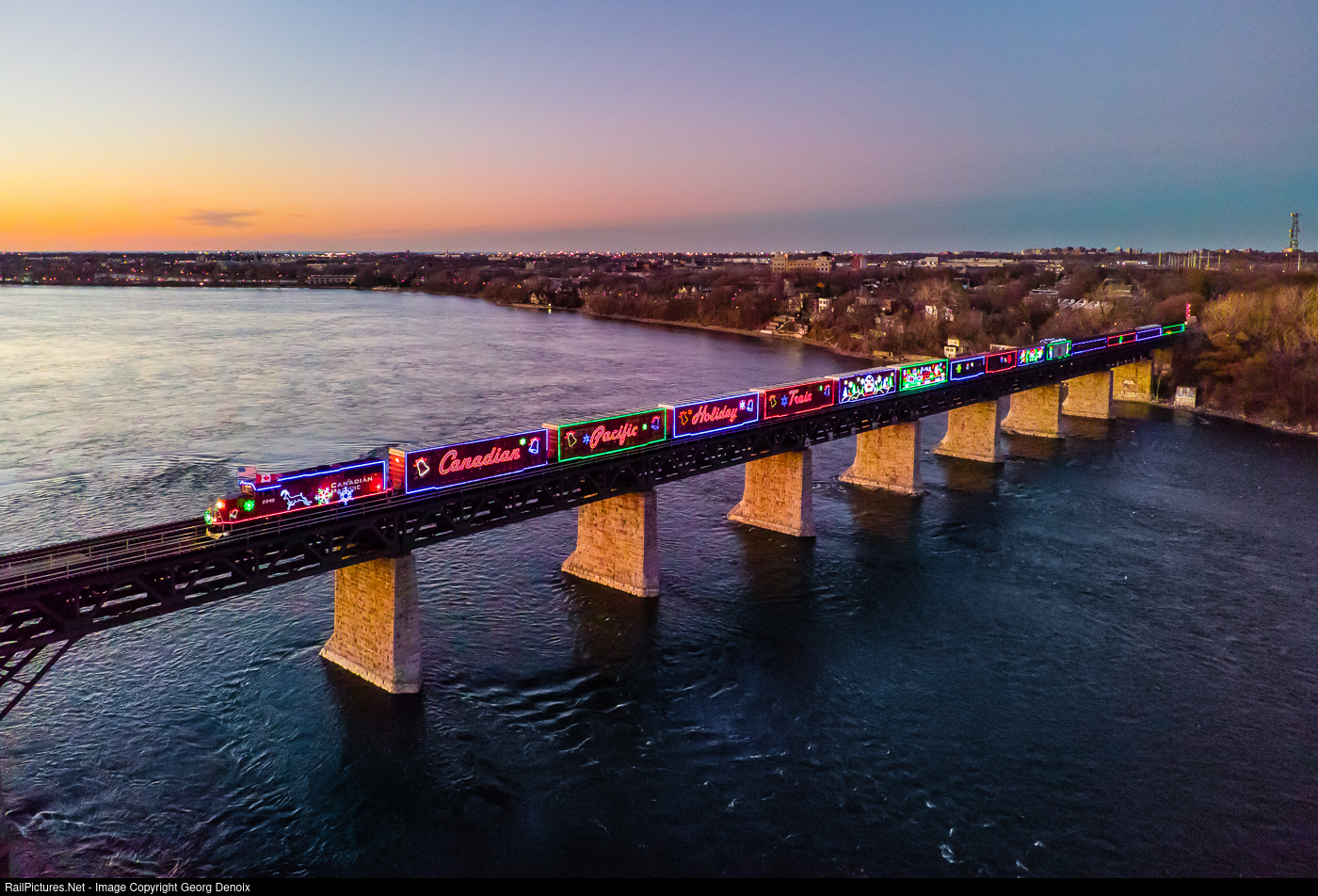 On its way South, the CP Holiday Trais sets out to leave the island of Montreal on CP's Adirondack Sub, crossing the St. Lawrence River just after sunset on a beautiful late-November evening.