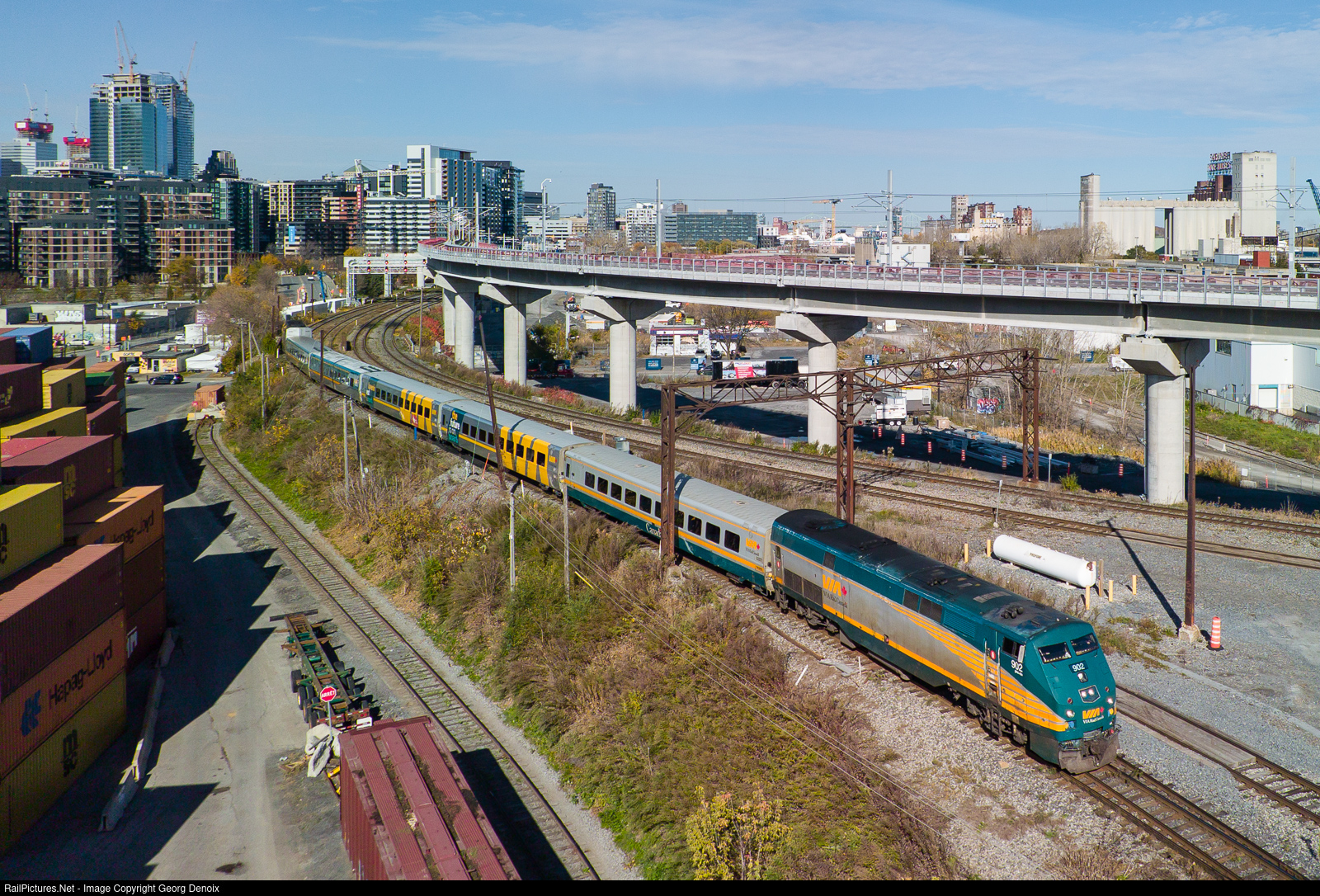 | VIA 67 to Toronto is sneaking its way through Pointe St-Charles, taing a turn westwards and leaving the double track line that leads East to the Victoria Bridge. The rusty structure the train is passing is one of the last remains of the 1943 CN electric operations which is on stark contract to the brand-new wire of the REM on the elevated structure. |