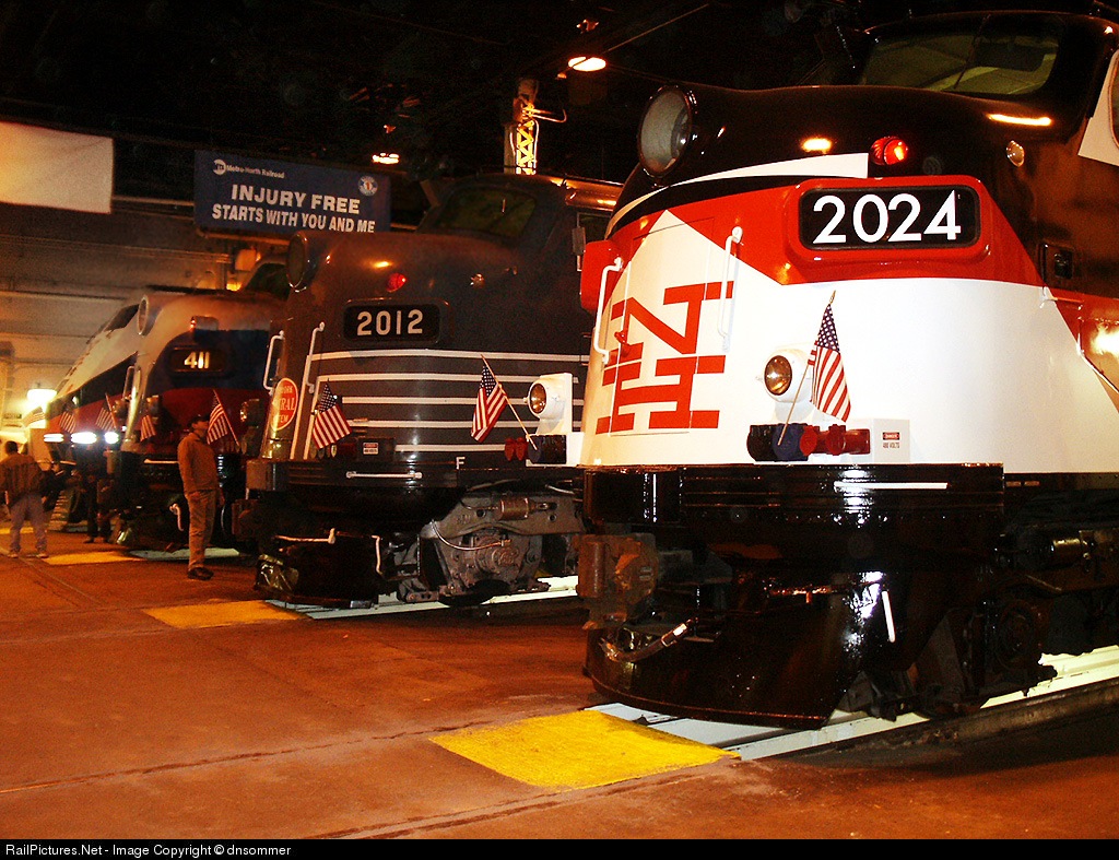 | FL9 #2024, FL9 #2012, F10 #411, and P32AC-DM #231 on display inside Metro-North's Harmon Shops at the annual Open House on October 16, 2004. |