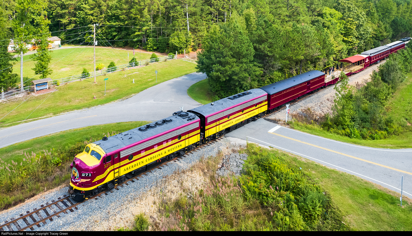 The ACWR's F9A-B set leads a set of passenger cars from Candor to Charlotte.