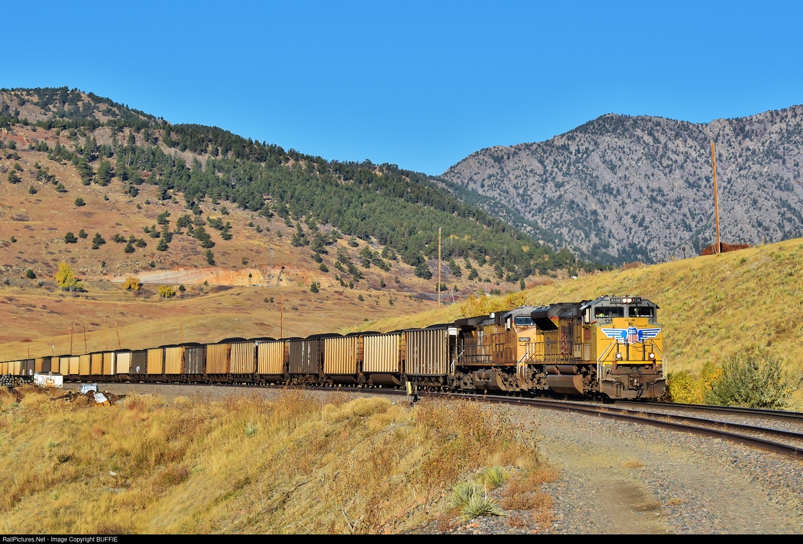 UP 8330 (SD70ACe) leads a coal through Rocky, Colorado.