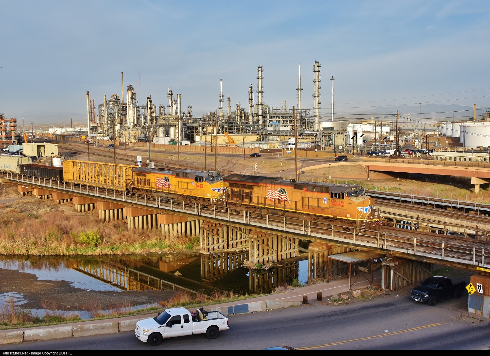 UP 2642 (ET44AH) leads a northbound freight through the refineries in Commerce City, Colorado.