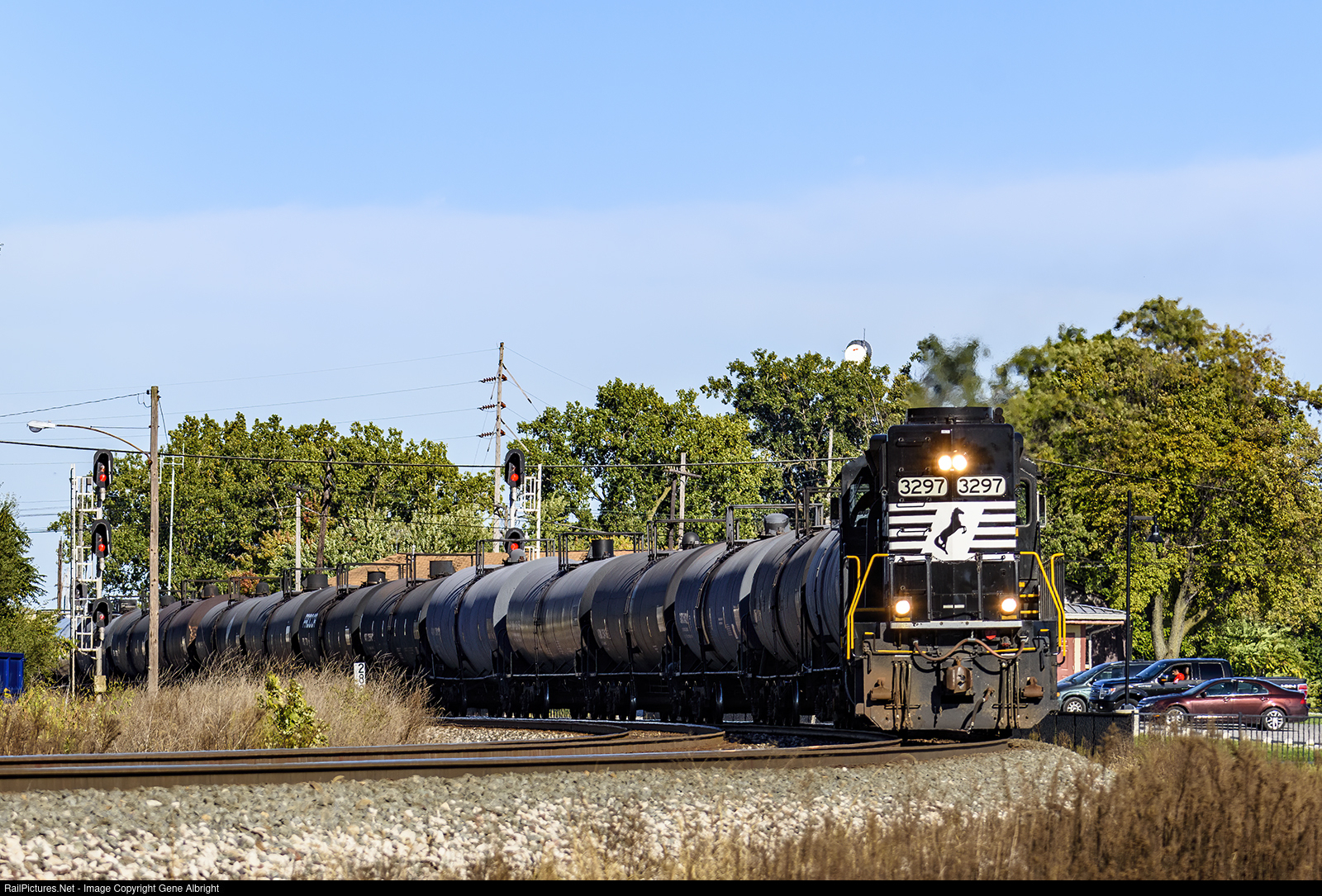 | Running long hood forward, NS 3297 heads west to do a little work, on a sunny October day. |