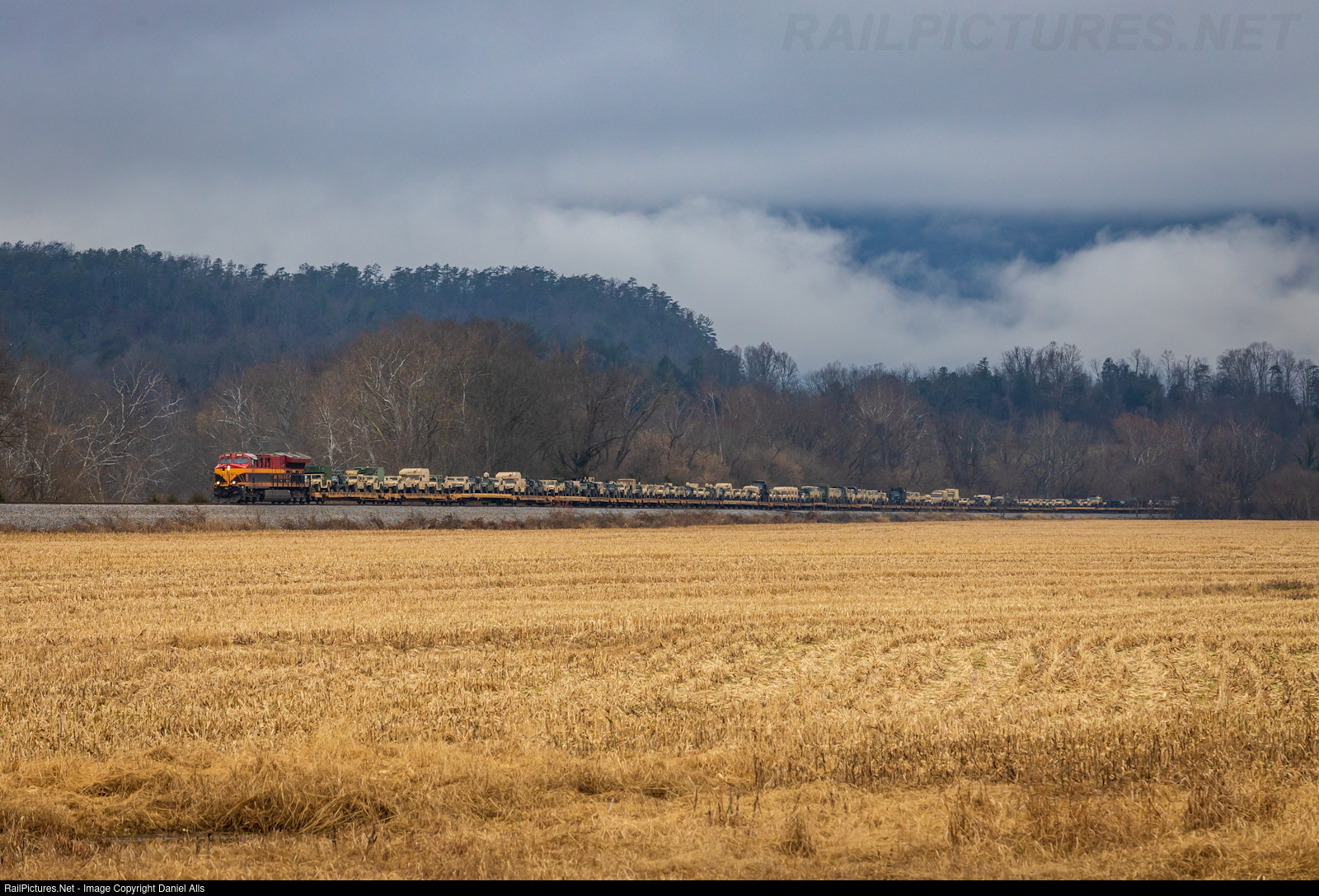 A single KCS tier 4 GEVO leads a military train east just outside of Eagle Rock, VA.