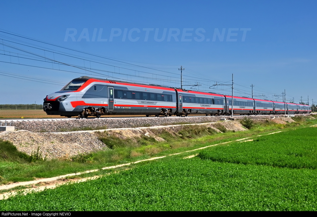 Trenitalia with the trains of the "Frecciargento" brand operates on high-speed lines but also on traditional lines, traveling up to 250 km/h. with various rolling stock, in the photo train ETR.700 with initial livery scheme (light type), coming from Bari and bound for Bologna Centrale.