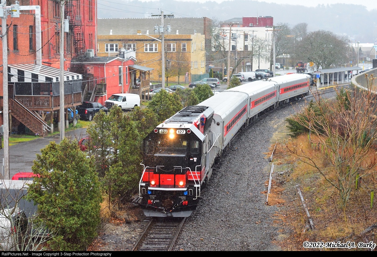 On a dreary last day of November, a solid set of Connecticut Department of Transportation equipment operates as Metro-North train 1922 from Bridgeport to Waterbury. The 1:18pm train has just departed the small station in Ansonia. The Brookville BL20GHM 127 was recently repainted into the CTrail scheme which still doesn't have any logos. The CDOT Bombardier Shoreliner cars behind the locomotive are, 6256 "Bethel", 6201 "The Connecticut Yankee", and 6217 "Yankee Doodle". Seeing solid sets of Metro-North are more common than CDOT ones so this was nice to see for a rainy Wednesday afternoon.