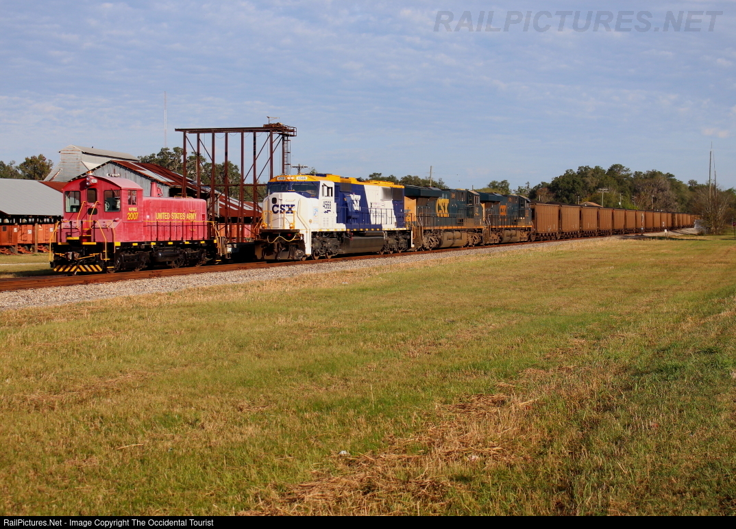 | One of the more noteworthy CSXT items to ever show up on Florida Northern. The "Operation Lifesaver" unit is leading 101 coal loads (100 PEFX & 1 OUCX) to the Red Level/Crystal River plant, a seasonal duty of 20 trains that used to be daily in better times. The US Army loco is lettered for & operated by Kirby Family Farms in town, which will be offering its seasonal holiday trains. |