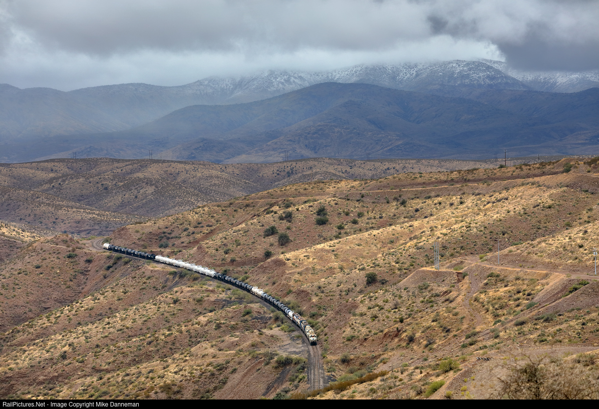 It’s rainy and cold in the high desert of Arizona as the third run of the day of Freeport McMoRan brings 34 cars down the ramp below Corral Road grade crossing between Morenci and Clifton on October 27, 2020. Snow dusts the higher mountain tops in this view from the old abandoned grade of narrow gauge Shannon Arizona Railroad, later upgraded and standard-gauged, and used by Phelps-Dodge as the rail link between Morenci and Clifton until 1965. This grade is now a hiking trail.