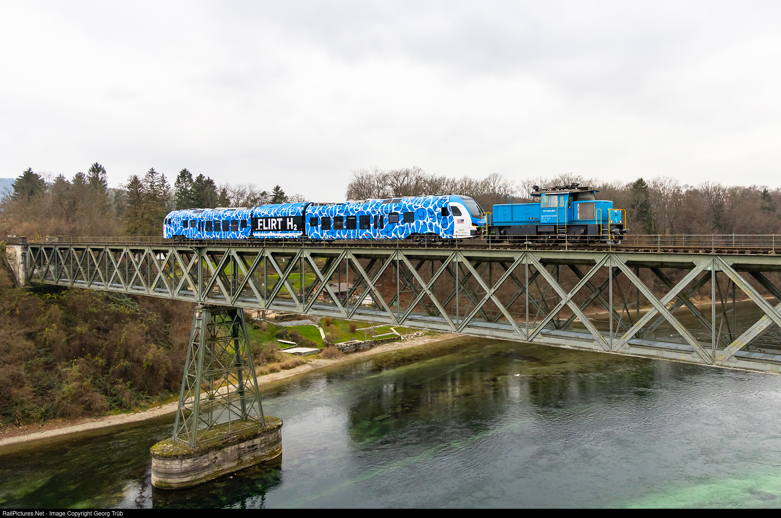 Electro/Battery locomotive Eea 936 # 133 of StadlerRail is pulling the new hydrogen Flirt "Flirt H2" for the californian Metrolink from Etzwilen over the Rhine bridge to Hemishofen. The new hydrogen powered train will make test runs on the former, never electrified, SBB line between Etzwilen and Singen, probably between Hemishofen and Ramsen. The line is now a museum railway line, owned by the foundation "Stiftung Museumsbahn Stein am Rhein – Etzwilen – Hemishofen – Ramsen & Rielasingen – Singen (SEHR & RS)". The train is destined for the Redlands Passenger Rail Project for the line between Redlands and San Bernardino. The power pack accommodates the entire hydrogen technology, from the fuel cells and batteries to the hydrogen tanks. This means that hydrogen technology is spatially clearly separated from the passenger compartments of the train. In November 2019, SBCTA (San Bernardino County Transit Authority) partnered with Stadler to design and build the first hydrogen-powered FLIRT.