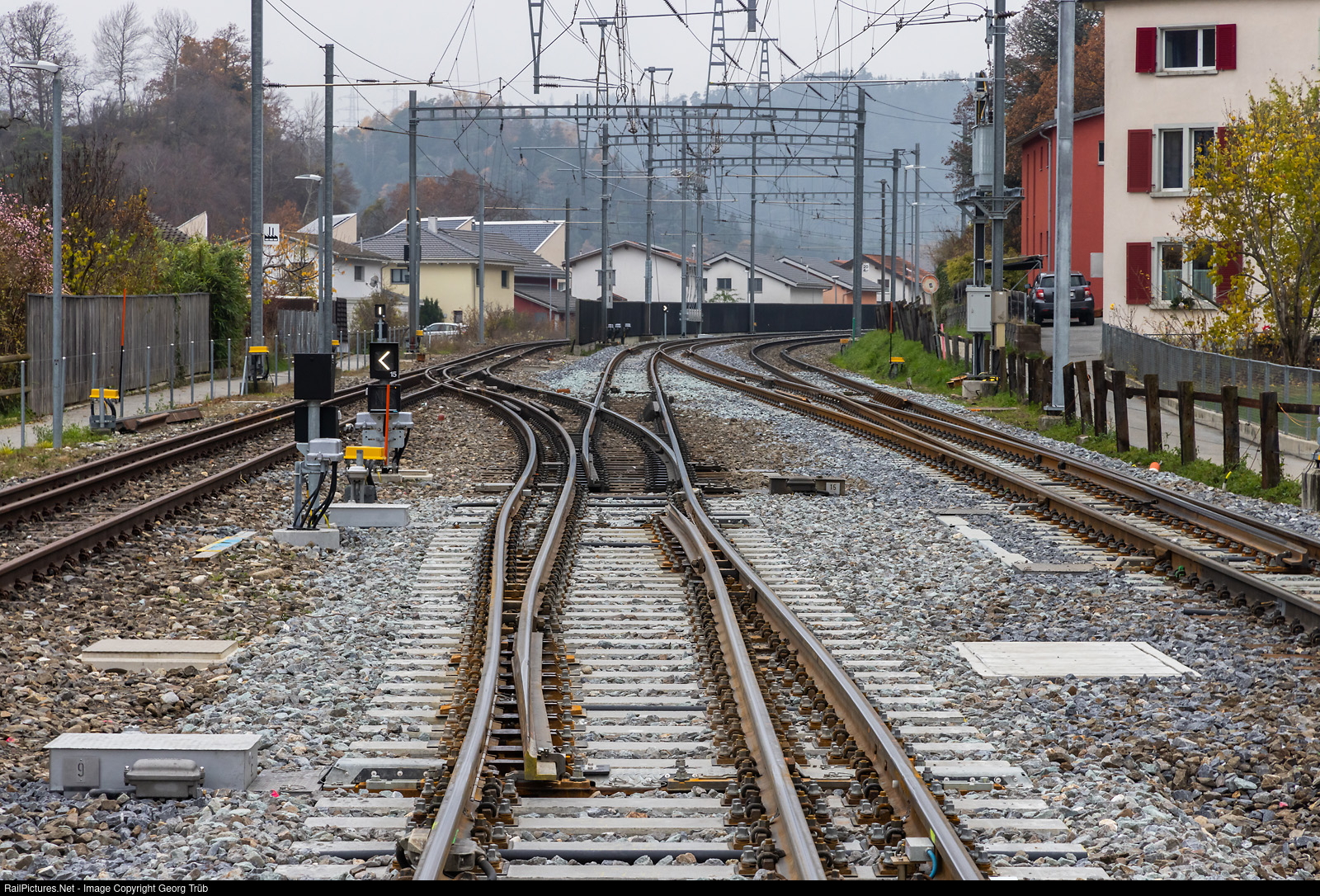 During the reconstruction of the Domat/Ems station of the Rhaetian Railway, this very special track swivel was installed. From Chur to Domat/Ems, the left track of the double track is a triple track (standard and meter gauge) to allow a standard gauge access to the large industrial area of the Ems works. From Chur to Domat/Ems, the 1 meter track is arranged on the right side of the standard gauge. In the station, a new, higher platform has now been built and the distance from the platform edge to the sliding step of the passenger vehicles would have become too large to meet the requirements of the Disabled Persons Equality Act. Therefore, the 1 meter track had to be swung to the left side of the standard gauge track in the area of the platform edge. Here, the standard gauge track swings to the left again and shortly thereafter turns left to Ems Werk. The new built crossover on the right in 1 meter gauge is built for 80 km/h when changing track.