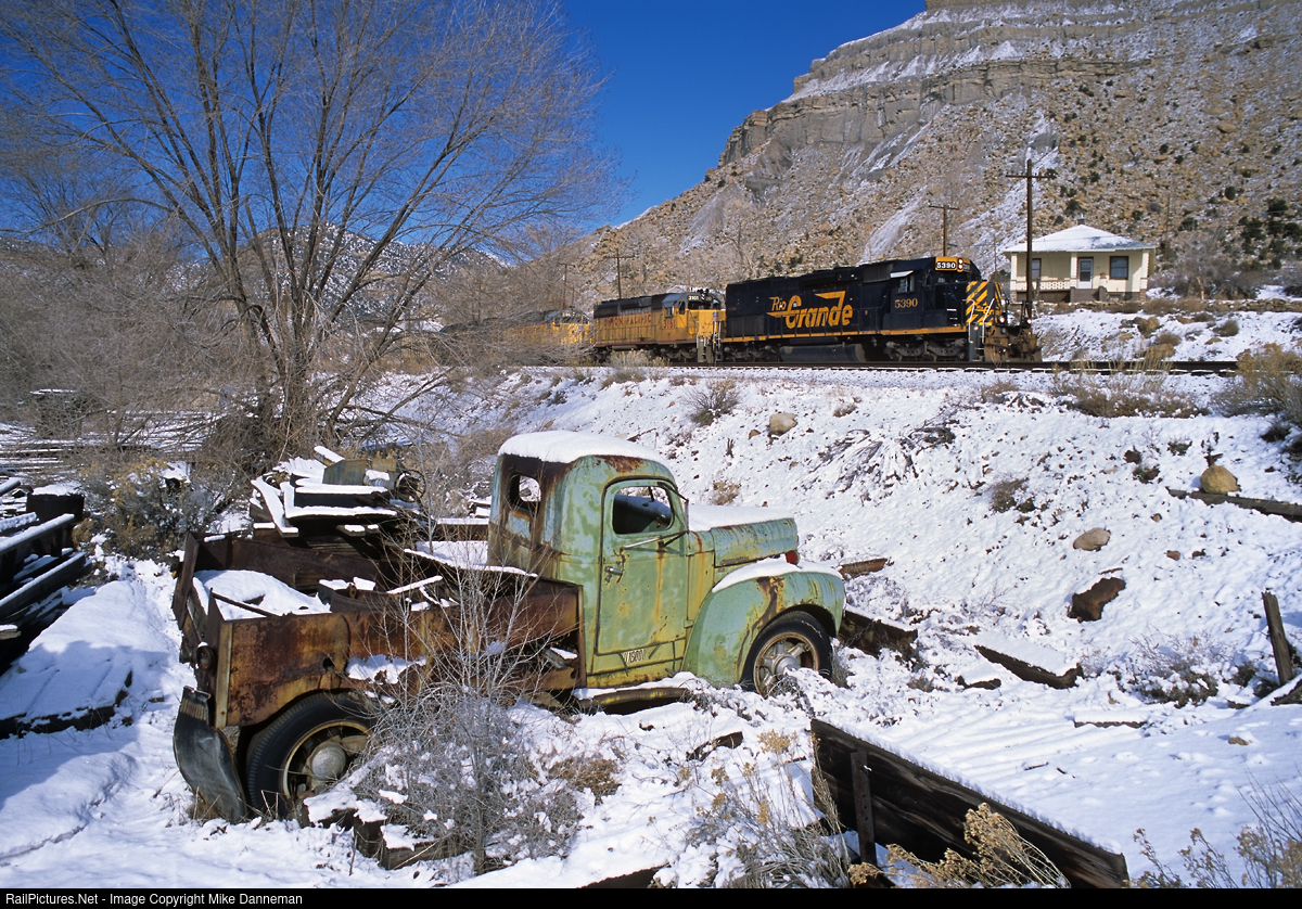 With Union Pacific LJP44 “dirt train” local from Salt Lake City late this particular morning, still crossing the grade over Soldier Summit, the LJP45 local out of Helper had some time to kill before the interchange was made. Trainmaster Kirt Jensen decided to have the Helper crew go up Price River Canyon and fetch a repaired bad ordered car from the house track at Kyune and bring it back to Helper Yard. On February 8, 2005, LJP45 rolls eastbound at West Helper, led by Rio Grande SD40T-2 No. 5390, and passes an old discarded truck as it approaches the yard.