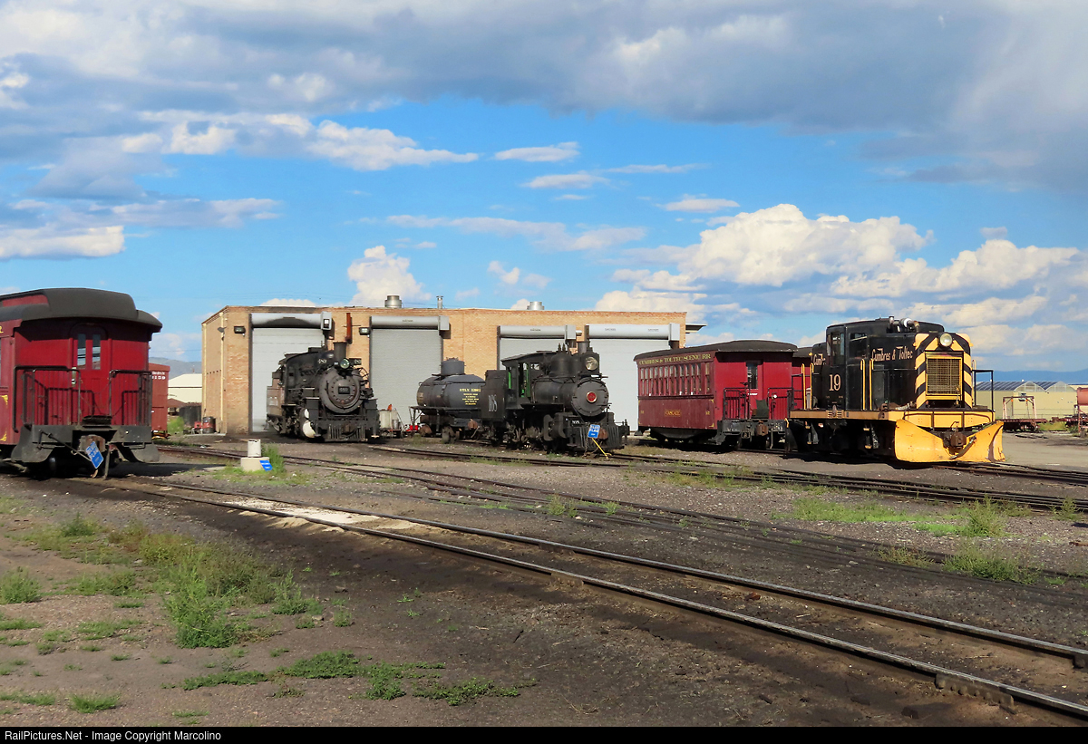 On 29th August 2022 5.30pm at Antonito: Steam loc #489 (left) will run with the carriages (left) to Chama the next morning. Steam loc #168 and diesel loc #19 are waiting for work.