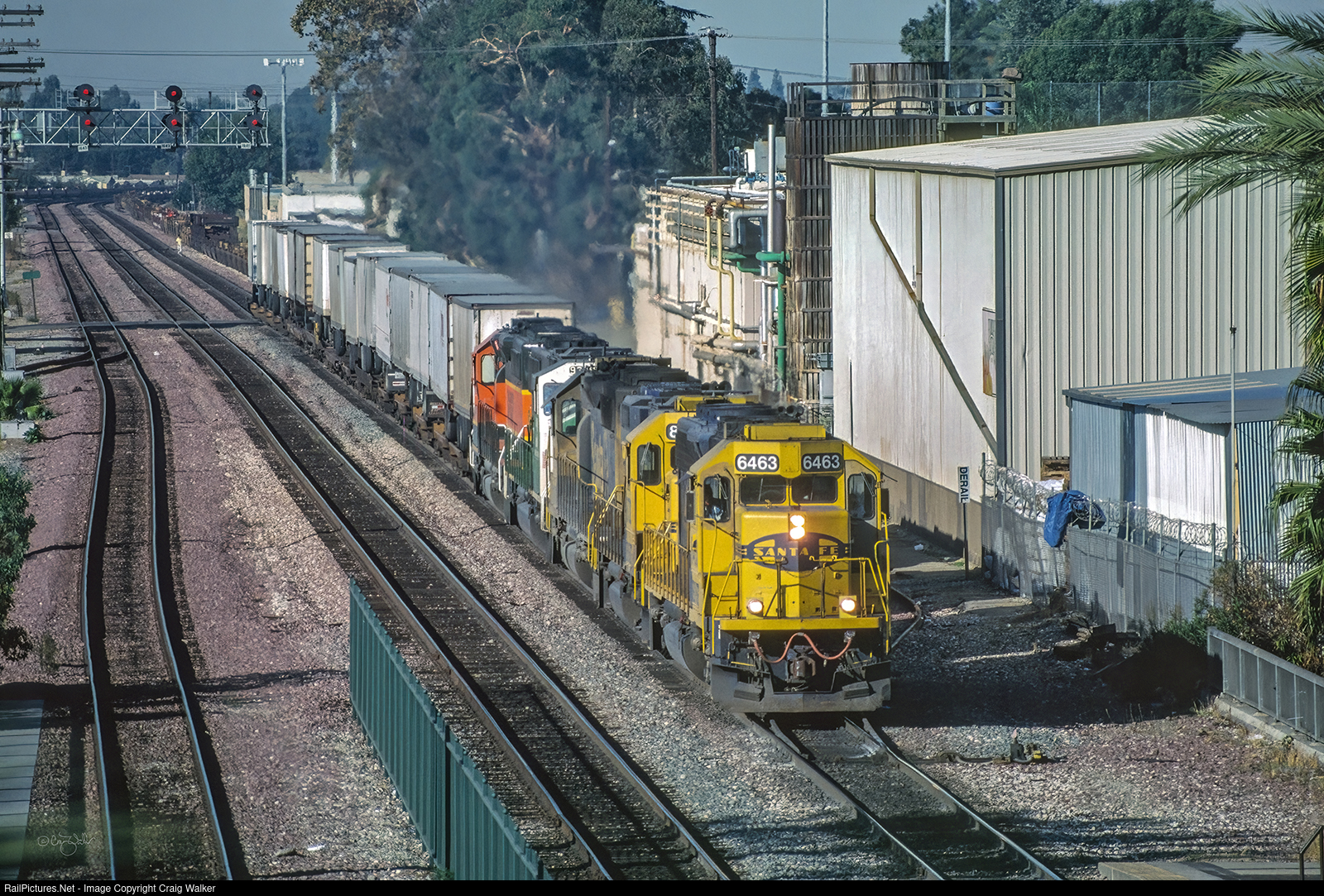 Heading east on the BNSF Railway’s San Bernardino Sub’s north main is short BNSF Priority UPS-LTL Intermodal train Z-LACWSP3-21 (Los Angeles to Willow Springs, IL), behind five colorful BNSF engines, led by SD45-2 6463 (ex-ATSF 5813, ex-7213, nee-5671). An intermodal train this short if fairly unusual. (Fullerton, California – November 21, 1998)