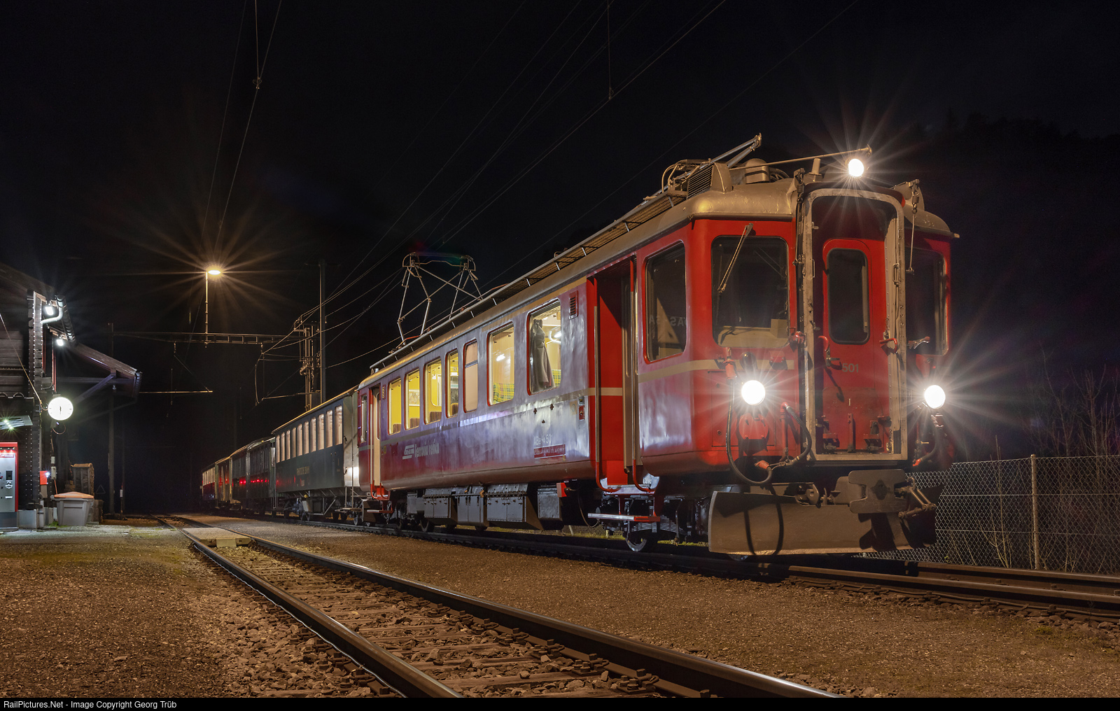 | The railcar ABe 4/4 # 501 of the Rhaetian Railway, built in 1940 by SWS, BBC and MFO, brought a passenger train for Santa Claus and many children to Versam-Safien in the gorge of the Vorderrhein. The train then continued as an empty material train to Valendas-Sagogn. The railcar ran around the train here and is now ready to travel back to Versam-Safien, Chur and Landquart. |