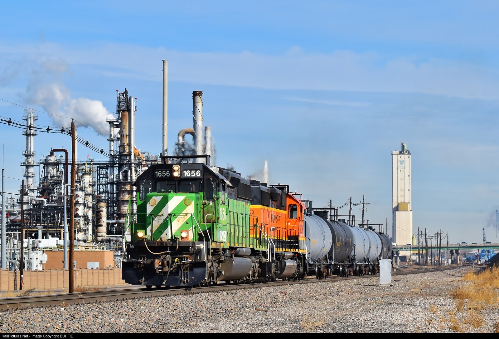 BNSF 1656 (ex-Burlington Northern SD40-2) runs through Commerce City, Colorado with a light load of oil cans.