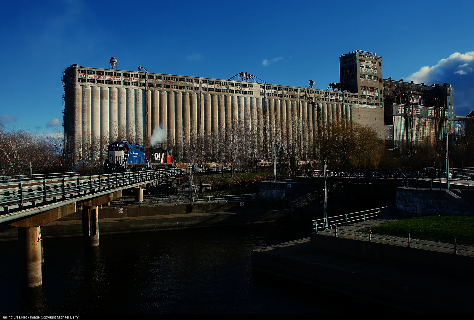 CN 500 is entering the Port of Montreal with baretables as it passes grain elevator #5.