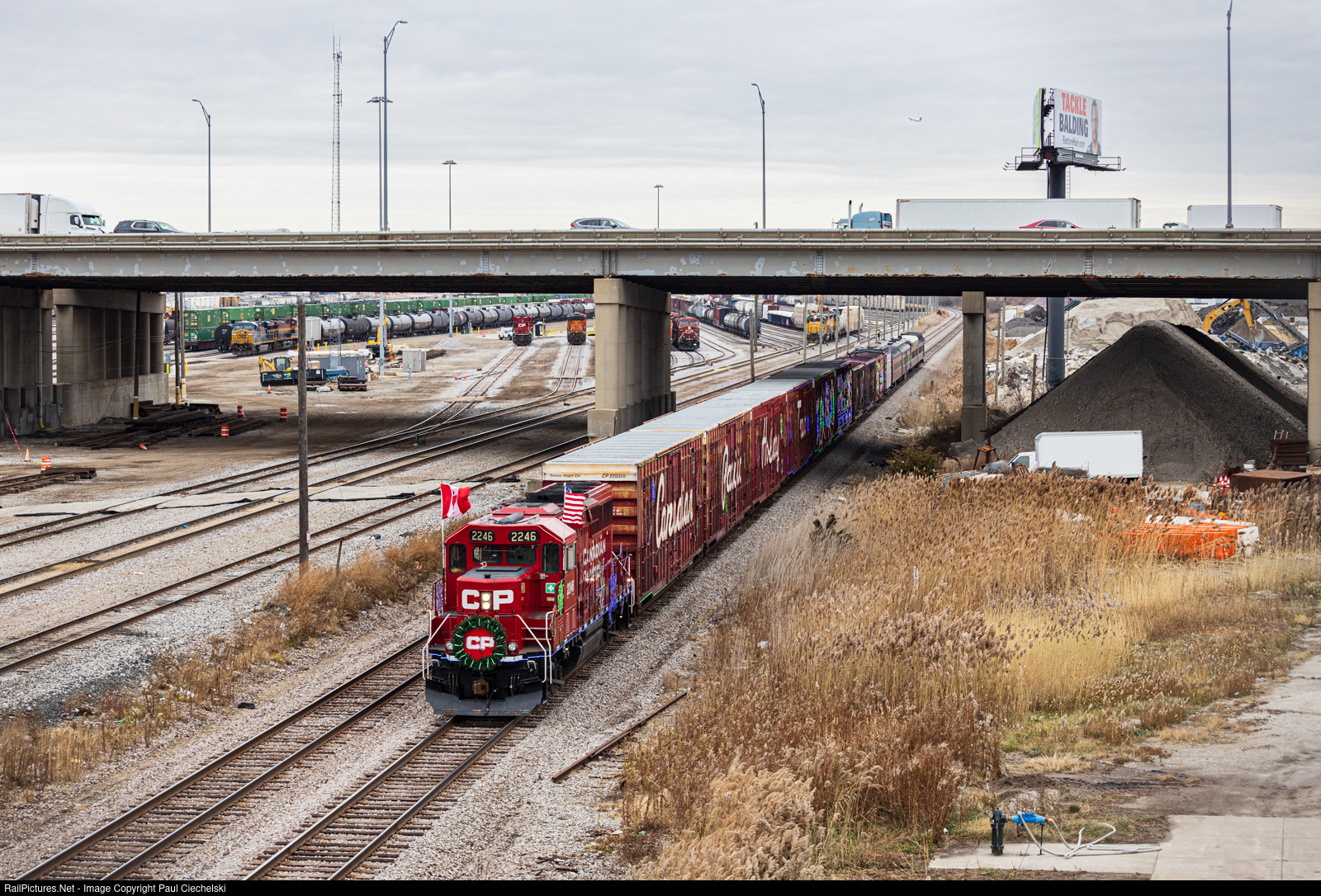 | The Canadian Pacific Holiday Train shoves past the east end of Bensenville Yard, headed towards Tower B17 to pull into the yard in preparation for the evening's show at Bensenville. |