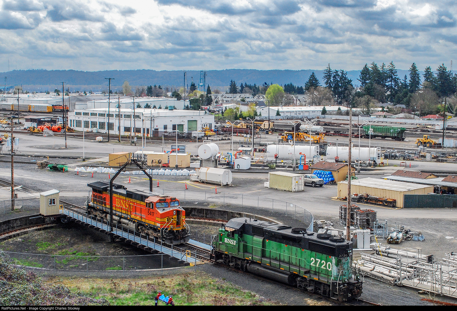 | VANCOUVER WA April 9 2011 — BNSF GP39-2 2720 and C44-9W 5417 are at the former site of the roundhouse on the south side of West 39th Street. The turntable has since been moved to the north side of the 39th Street overpass to make room for a run-through track. My photo.