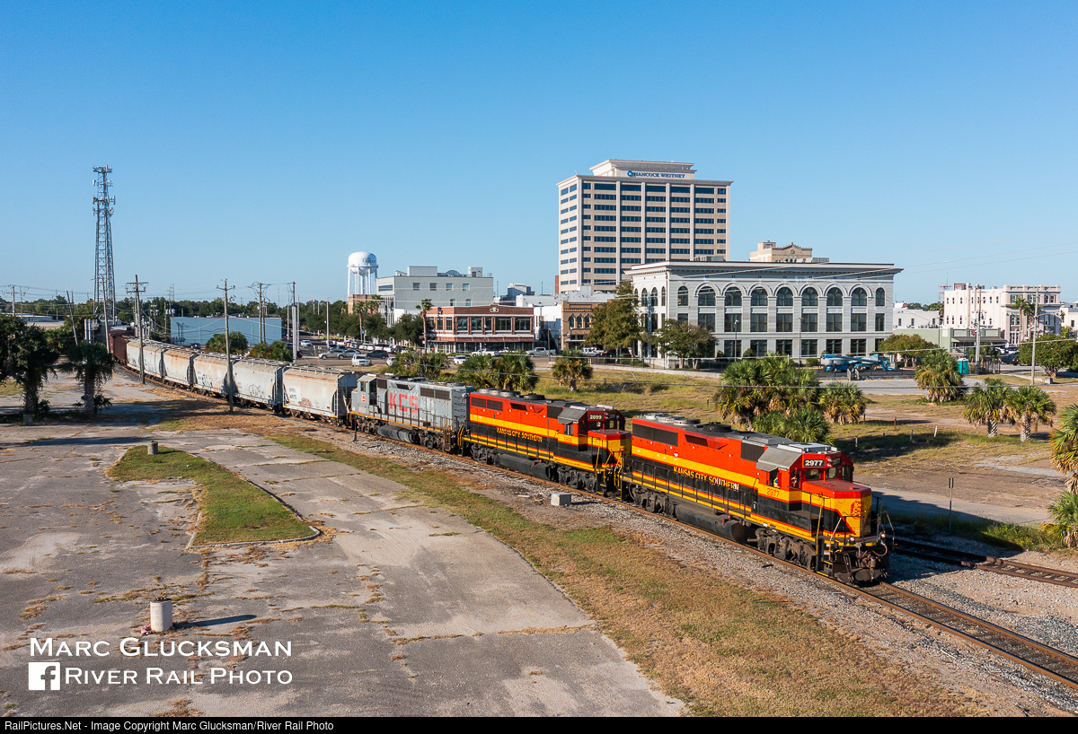Port Job. On the afternoon of September 28, 2022, Kansas City Southern 2977(GP40-3, née-KCS 797, GP40-2, EMD, 2/1981), 2899 (GP40-3, née-DRGW 3108, GP40-2, EMD, 12/1972) and 2911 (née-CN 9488, GP40-2LW, EMD, 9/1974) head down the the waterfront in Gulfport, Mississippi to make one of their daily interchanges with the marine terminal. The train is seen approaching the former Gulf & Ship Island Railroad Office with the Gulfport commercial district in the background. With the merger date with Canadian Pacific Railway looming but still unknown, there is no time like the present to catch these classic "belle" and "ghost" painted standard cab units.