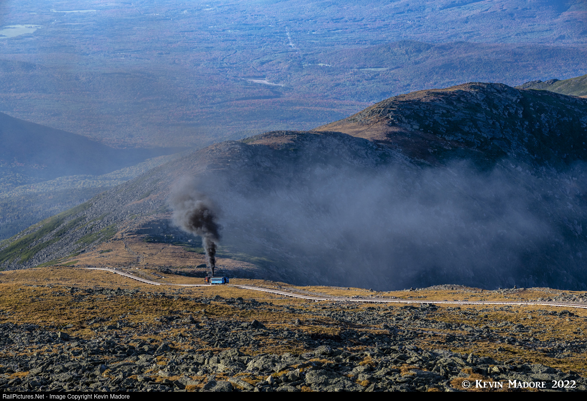 Entering the home stretch. Just about an hour before official sunset, the 4 PM steam trip on the Mt. Washington Cog Railway climbs above the col between Mt. Washington and Mt. Clay, and begins to run through the home stretch, just below the summit. Although it looks pretty flat compared with the 25% grades just behind the train, it is still pretty steep here, and there are several hundred vertical feet to climb and about 10 minutes of travel before the trip is done. Note the exhaust plume rising vertically here before dispersing over the Great Gulf to the north. The winds this day on the summit are less than 10 knots and the temperature is about 65F....about as nice as it ever gets up here. And then there is the view. There is nothing quite like being on the summit on a nice, clear fall day like this one.