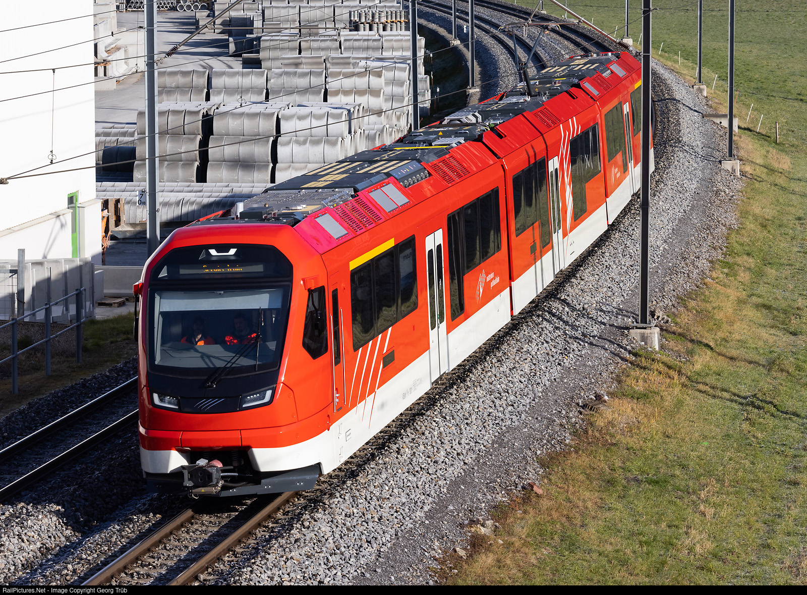 | Brandnew "ORION" train ABeh 8/12 # 301 of the Matterhorn-Gotthard-Bahn (MGBahn) on a brake test run on the Rhaetian Railway network in Untervaz-Trimmis. The MGBahn ordered 12 of this adhesion/cogwheel drive trains from StadlerRail, 15 more are planed for the future. |