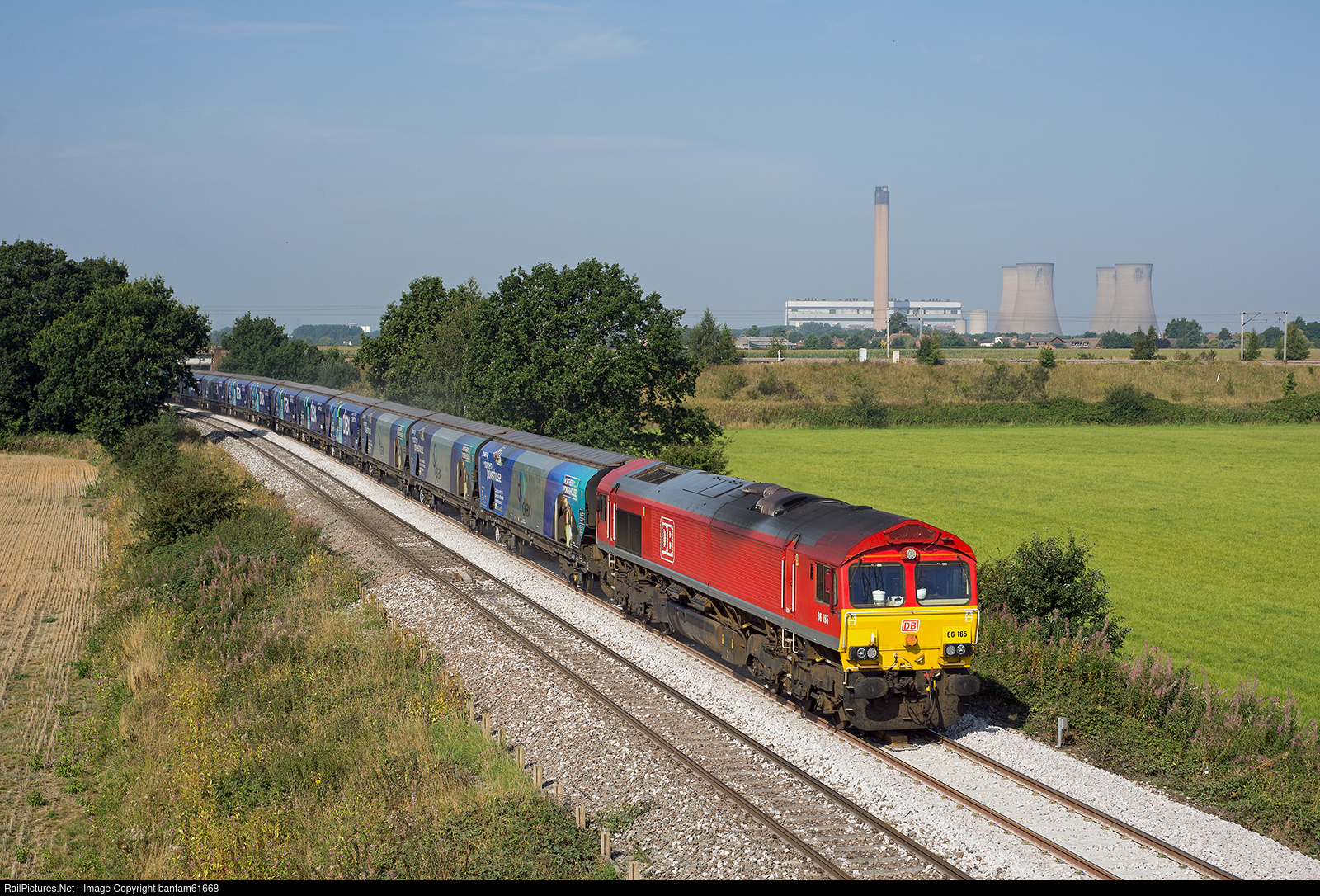 | With the remaining 4 cooling towers of the closed Eggborough power station behind, 66165 passes Heck Ings with 6H62 08:15 Immingham Biomass LP to Drax power station |