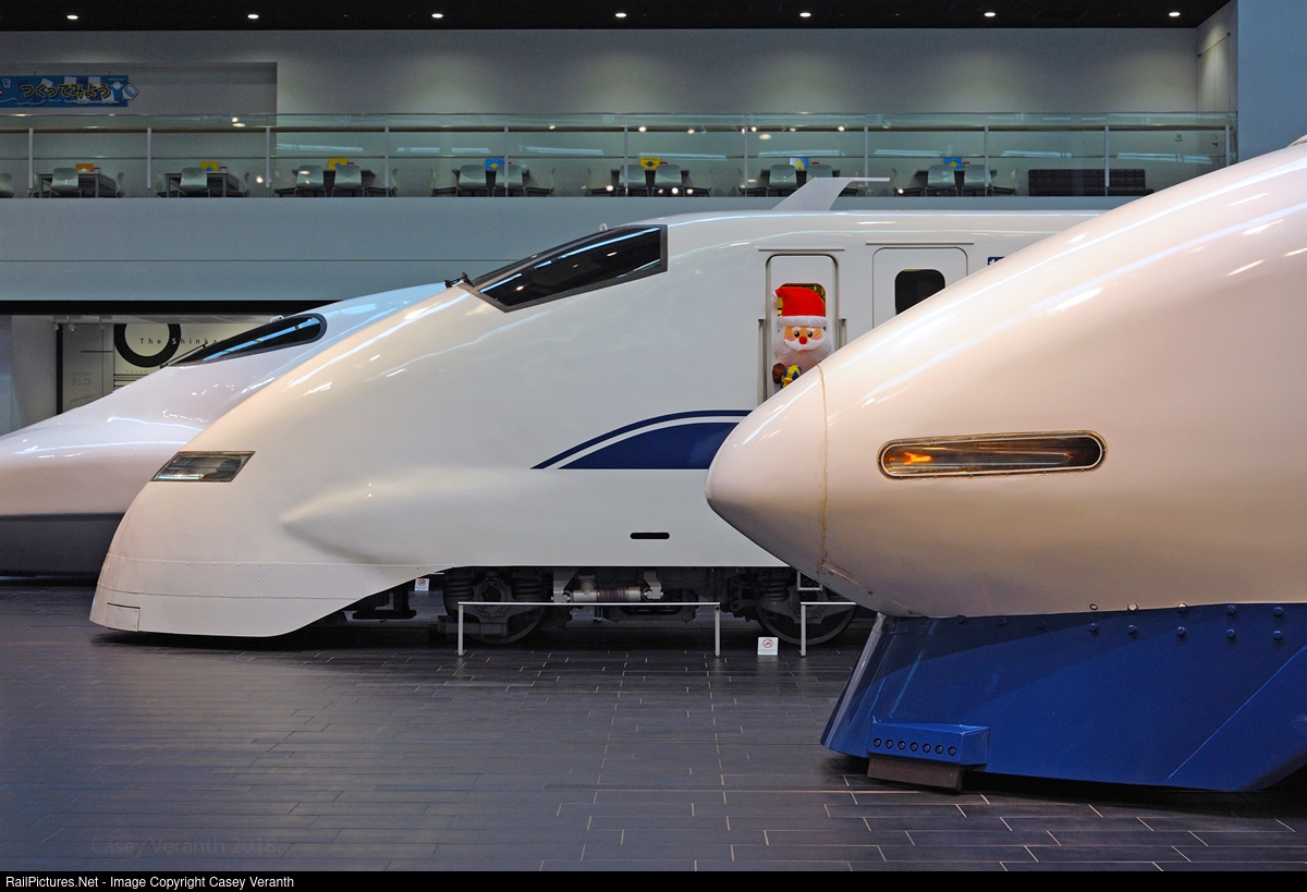 | The 300 series Shinkansen bullet trains were introduced in the 1990s as replacements for the 100 series (the nose on the right). Behind the 300 is a 700 series which is the replacement for the 300 and currently the most common bullet train. That is a Santa Clause on the 300, Christmas is celebrated in Japan, more for as a commercial holiday though like Valentines. |
