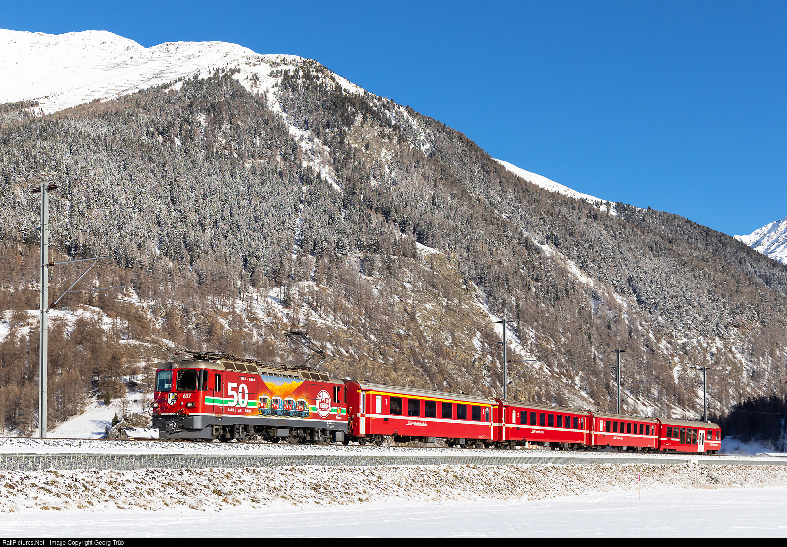 | Ge 4/4 II # 617 "Ilanz", in the publicity paint scheme for 50 years LGB 1968 to 2018, is pulling the regional train 1944 from Pontresina via Samedan-Zernez to Scuol-Tarasp, between Carolina and Zernez. |